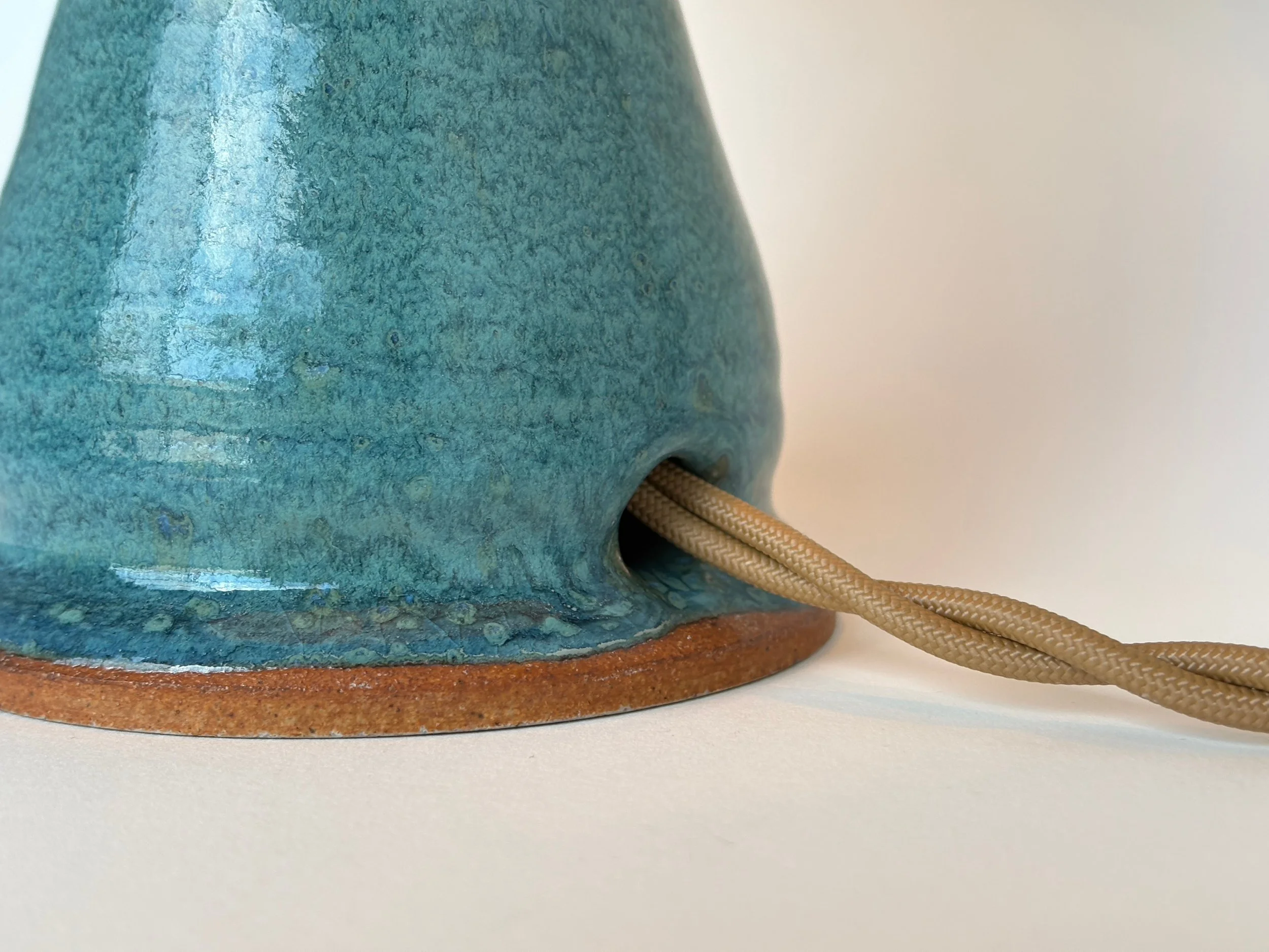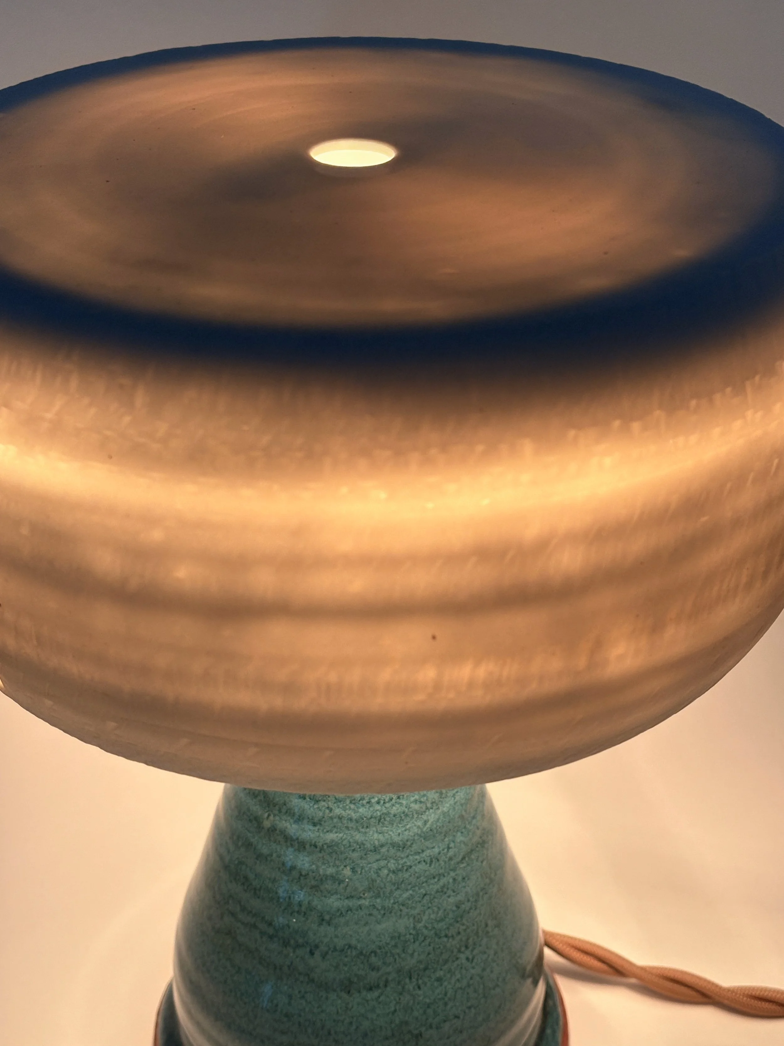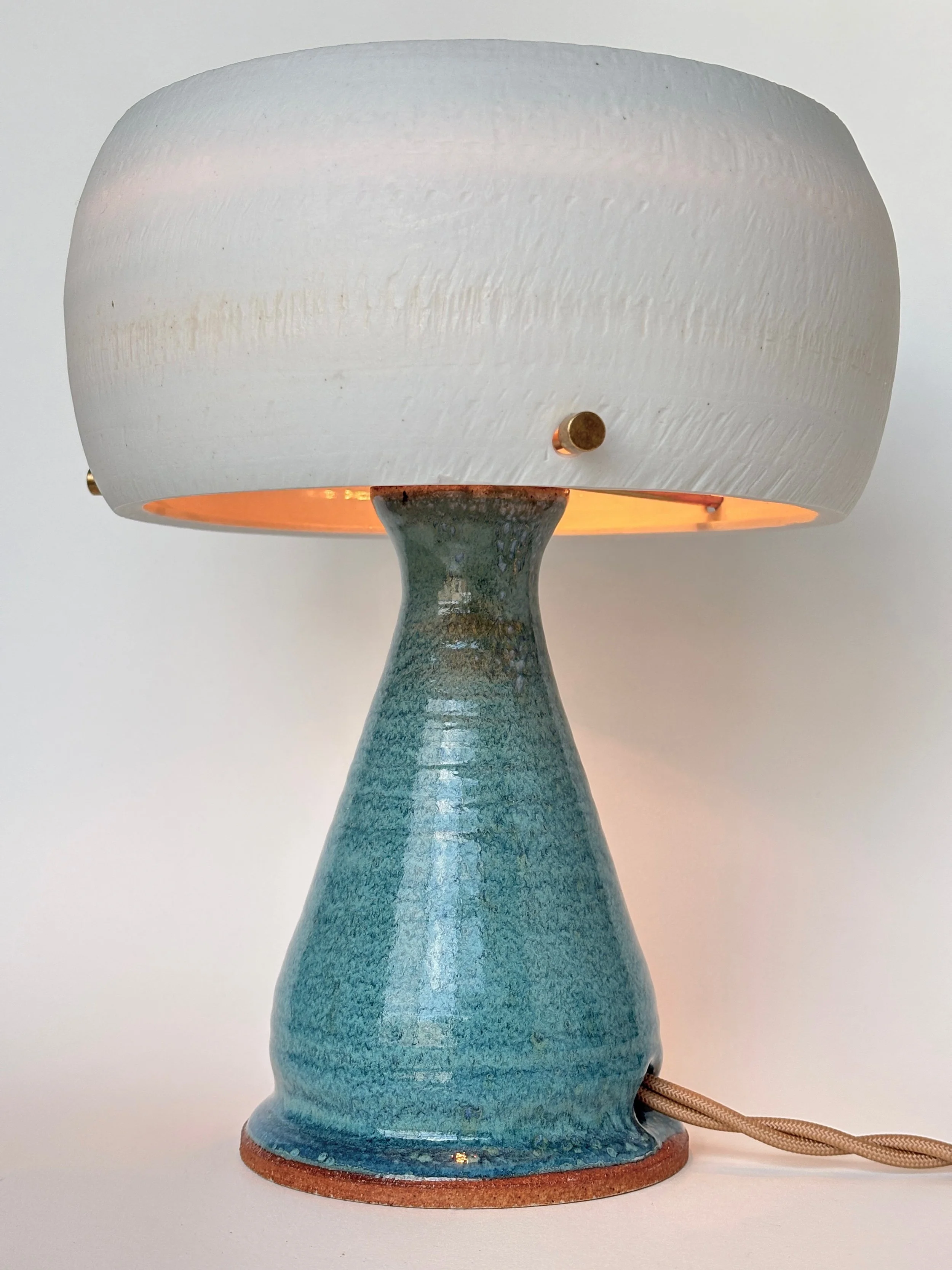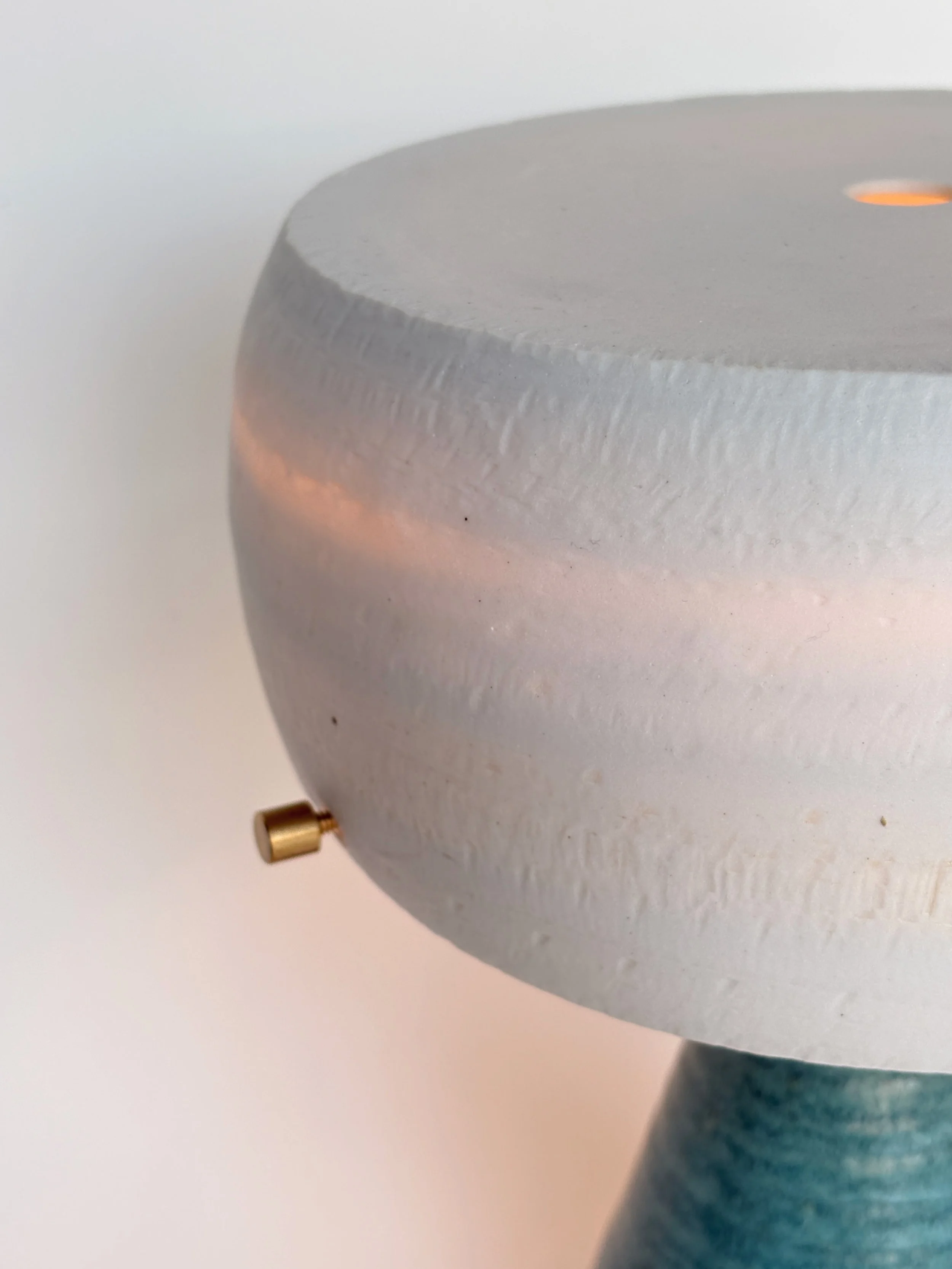 Stoneware base with subtle texture, glazed in a stunning aquamarine blue. Translucent porcelain shade balancing light emission and diffusion.