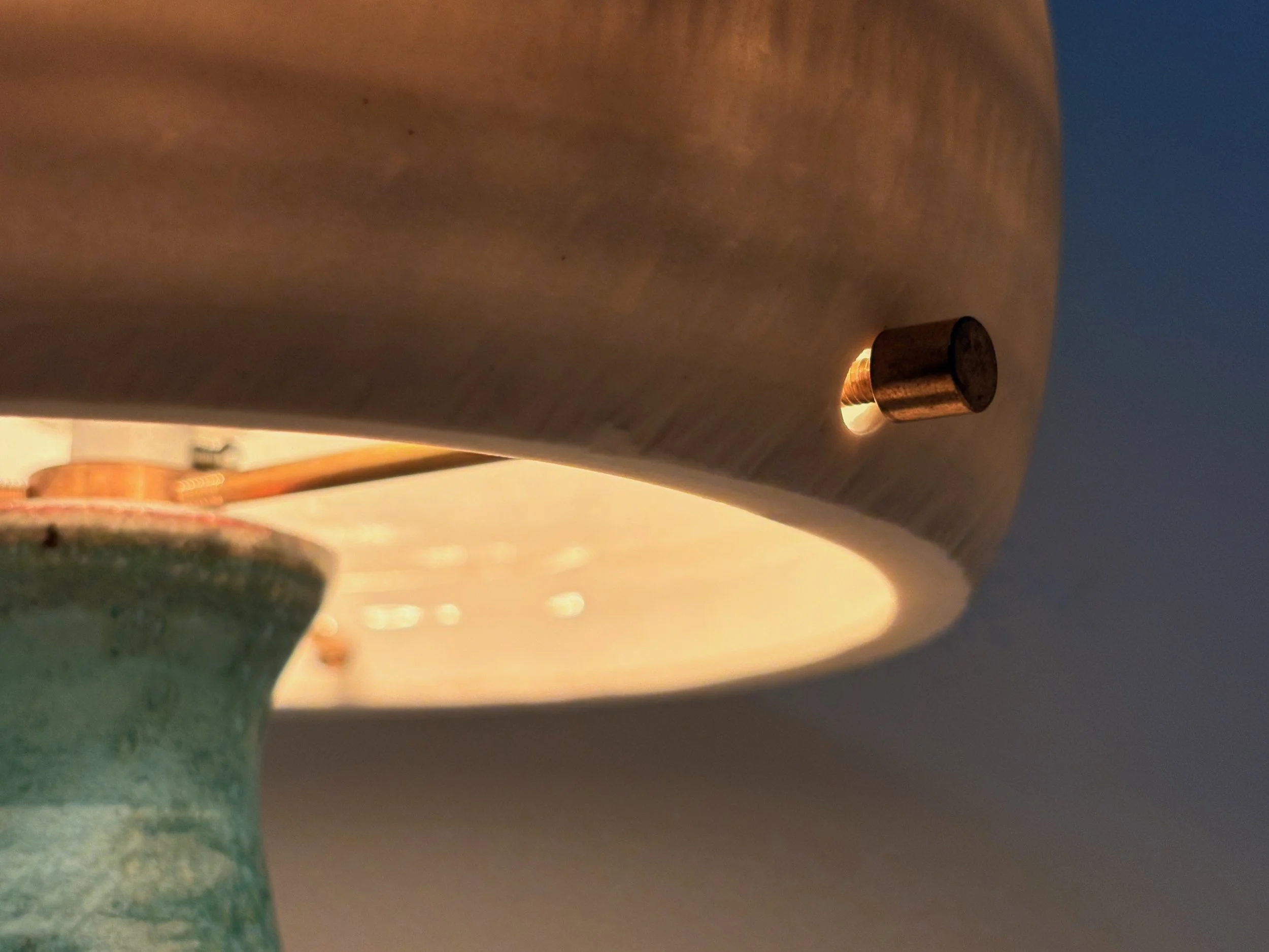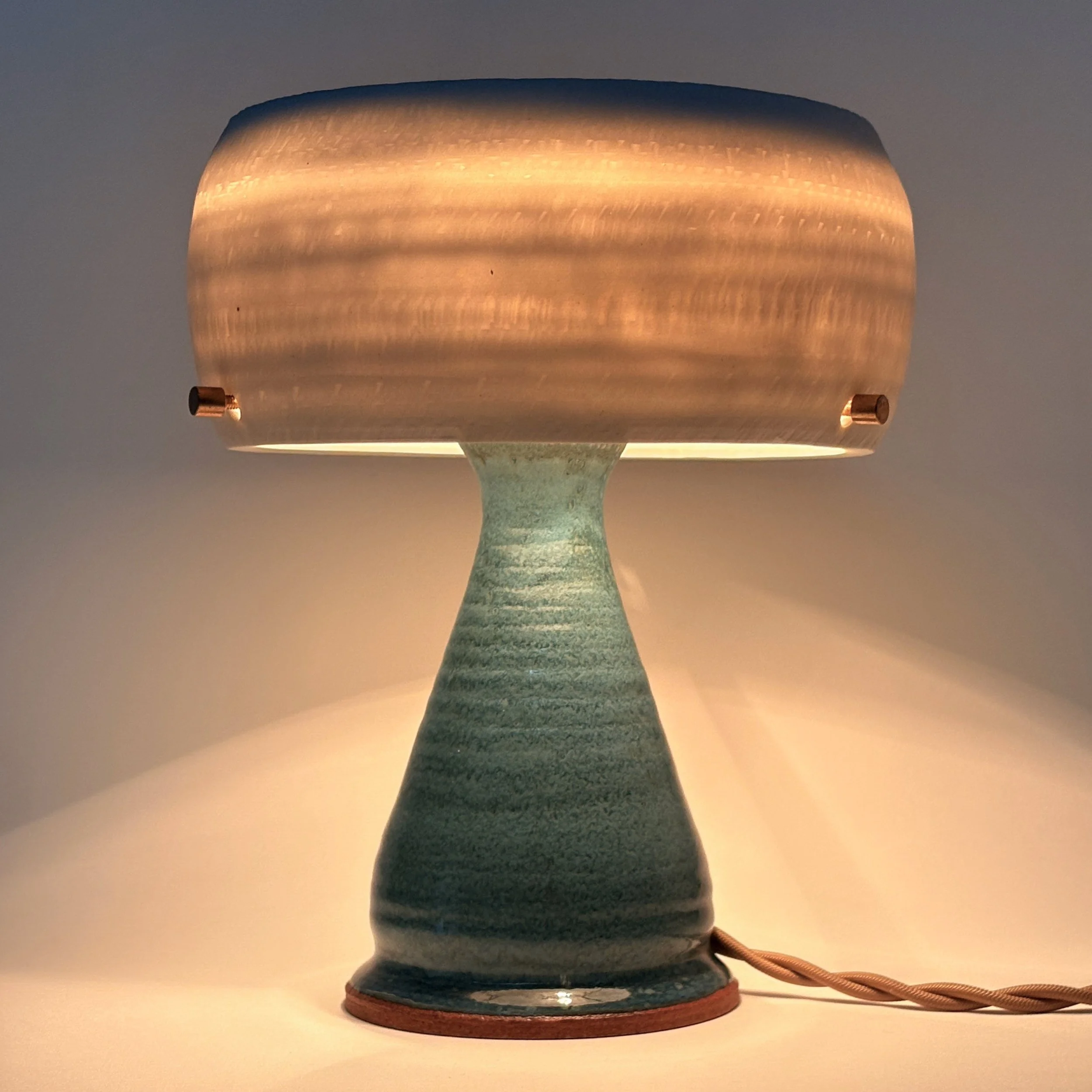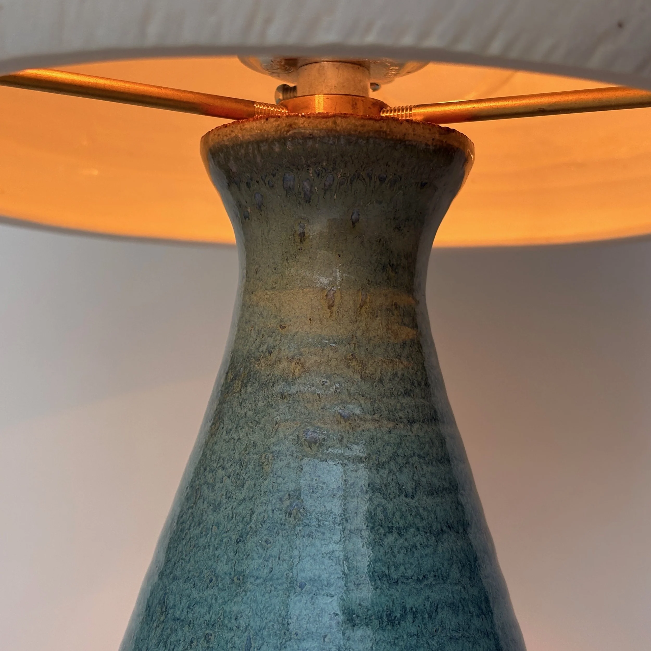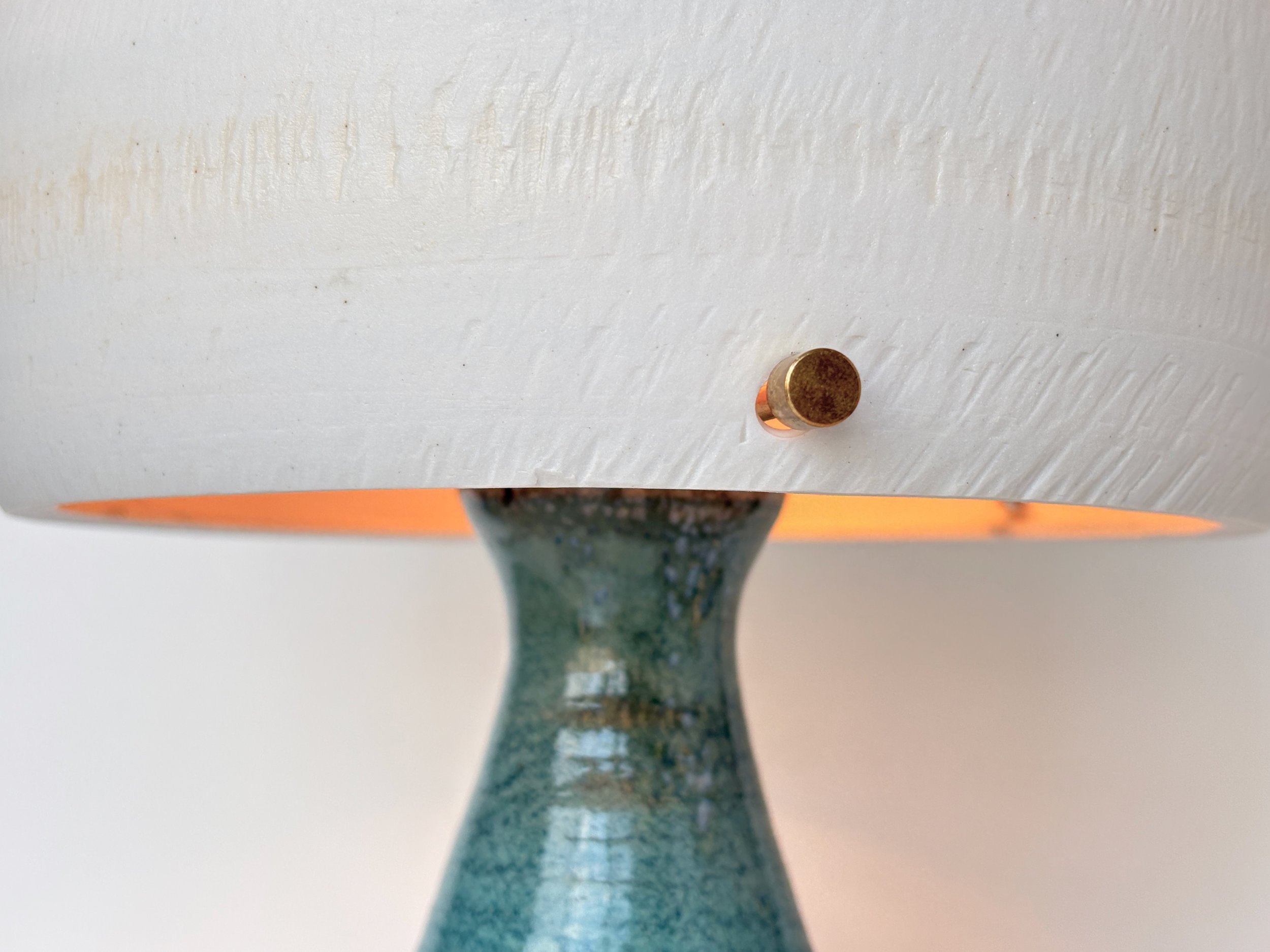 Stoneware base with subtle texture, glazed in a stunning aquamarine blue. Translucent porcelain shade balancing light emission and diffusion.