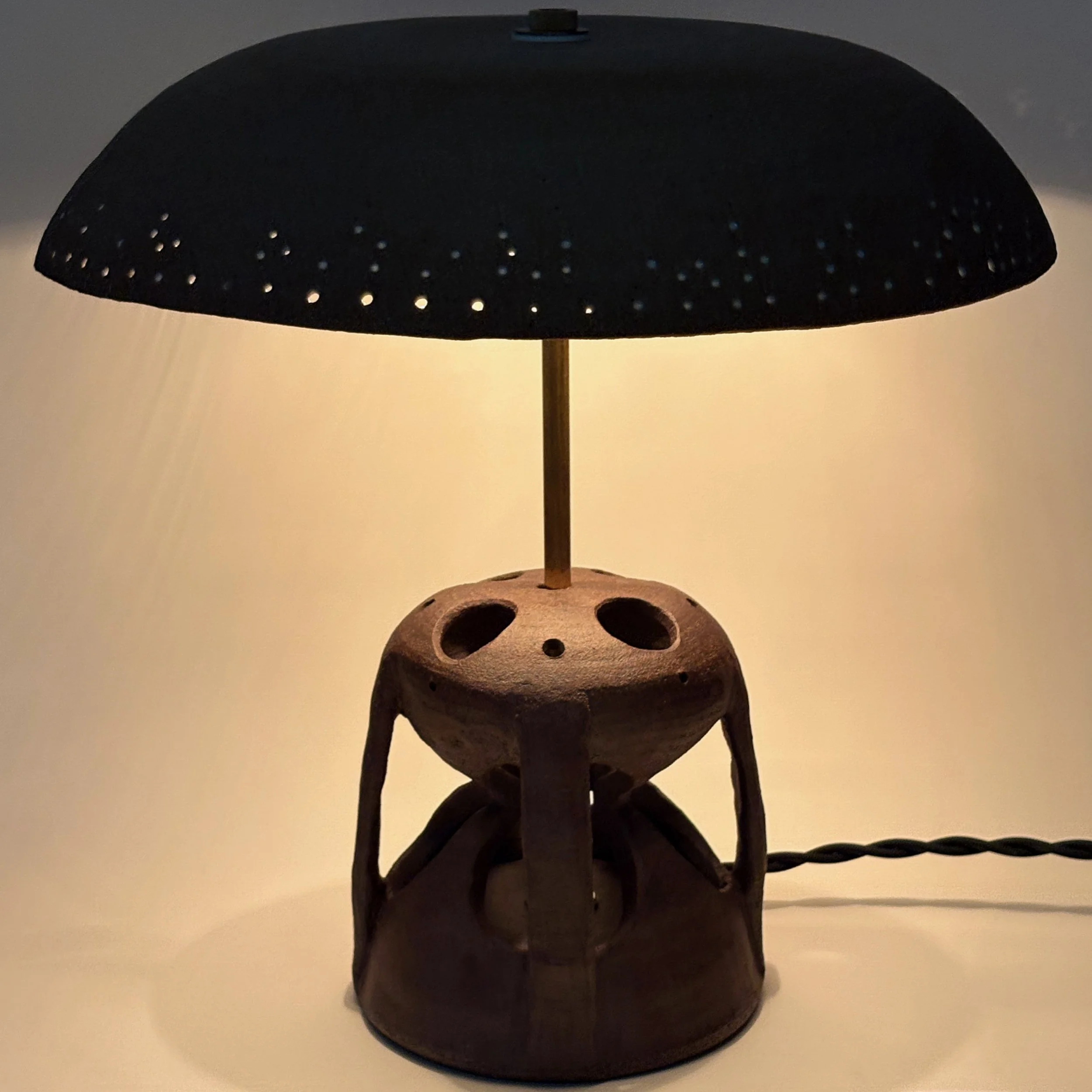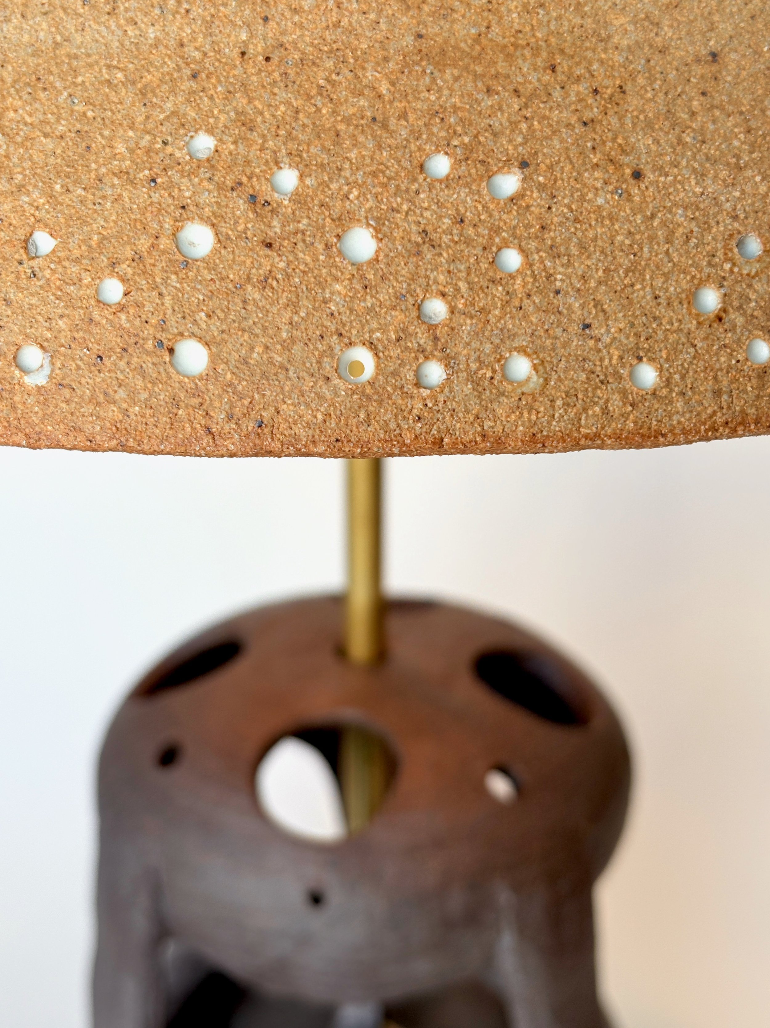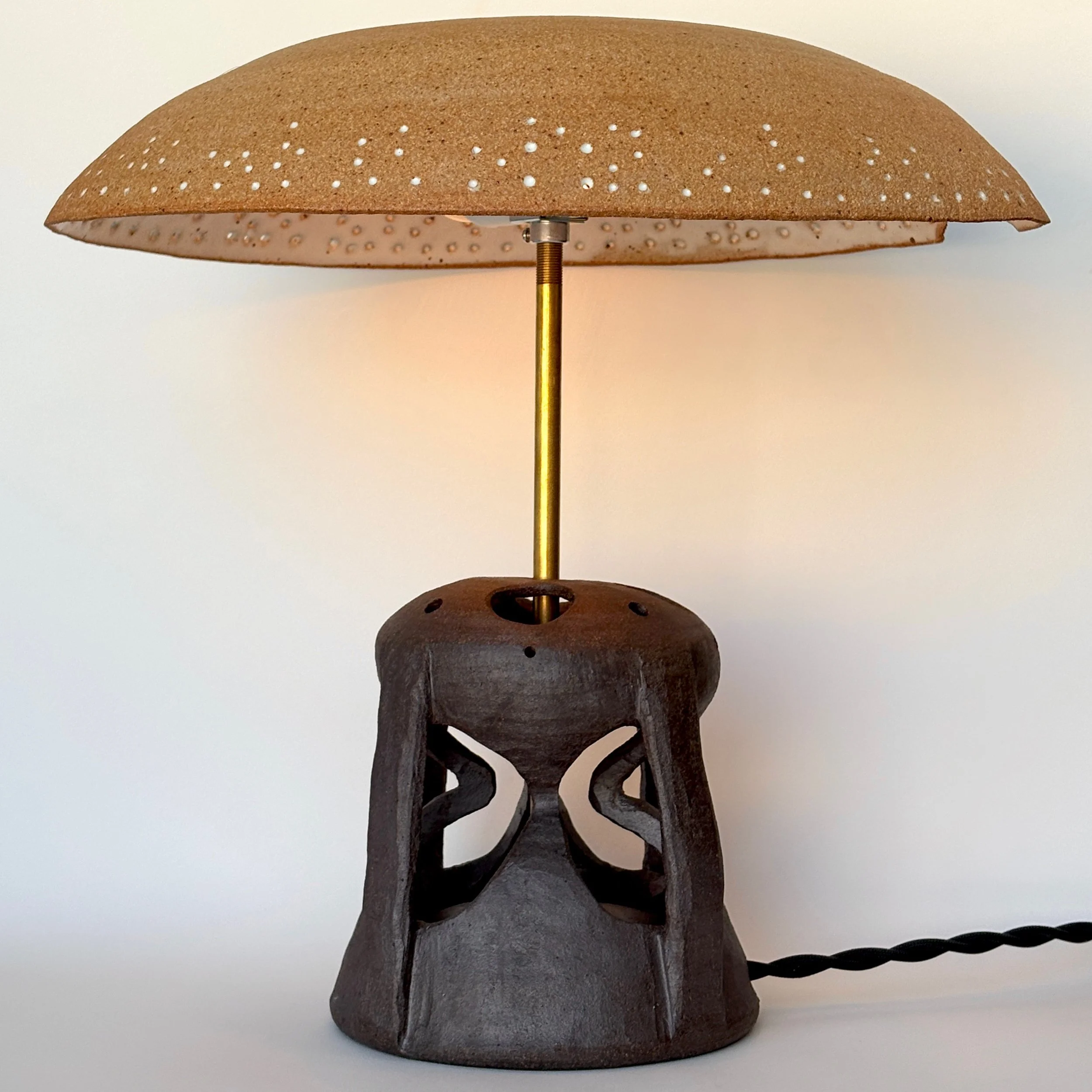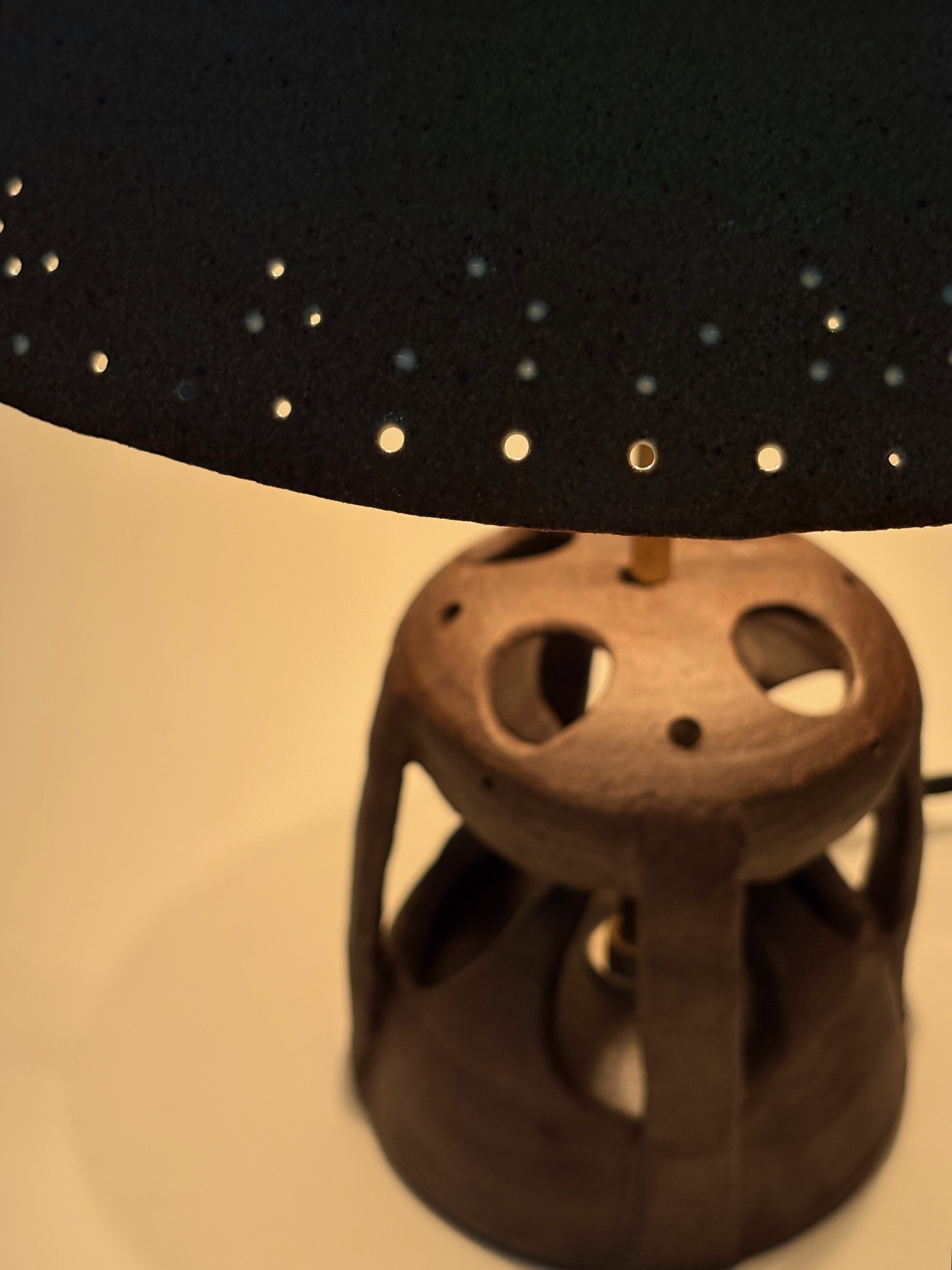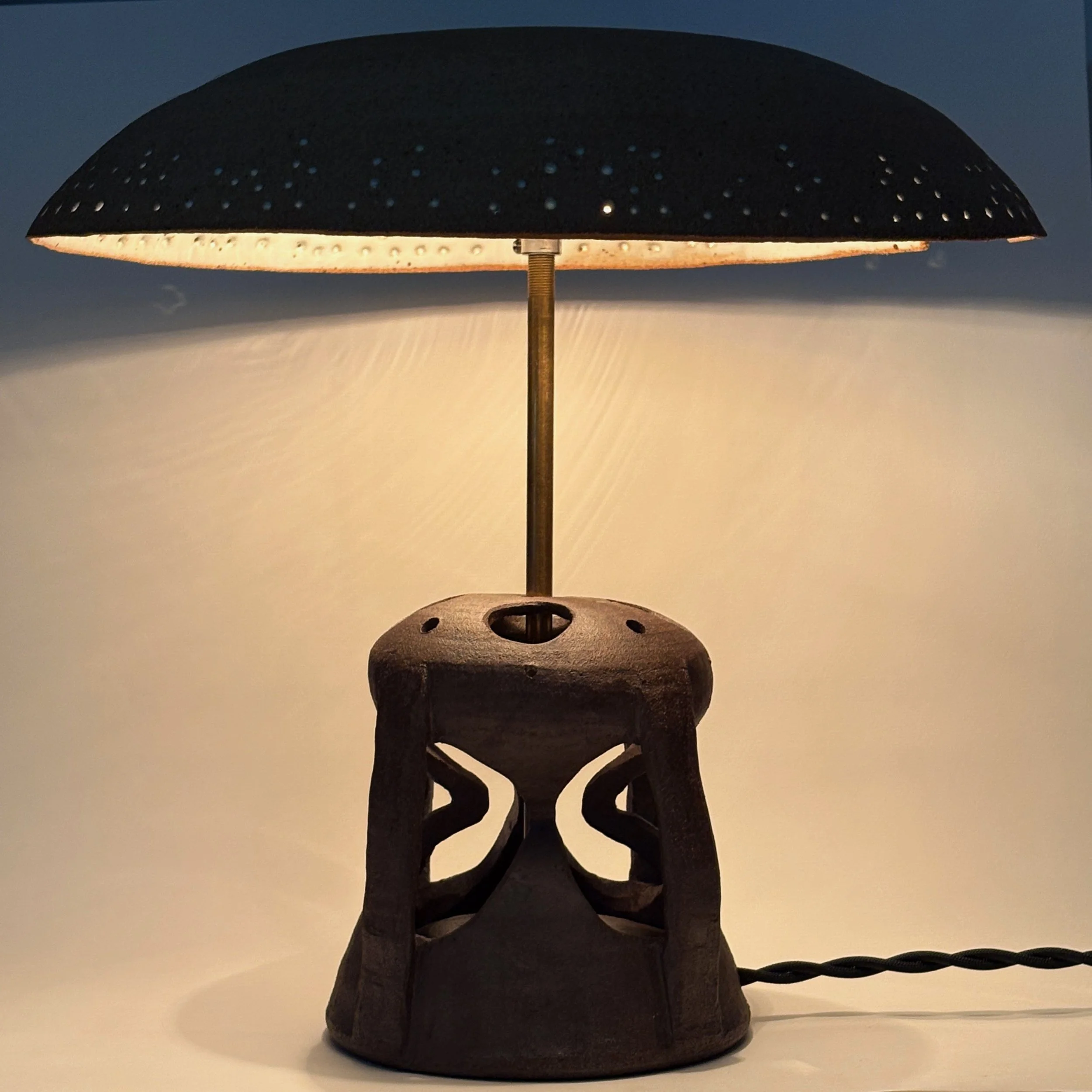Hand-thrown, carved stoneware base with organic patterns. Stoneware shade with undulating perforations along the edge.