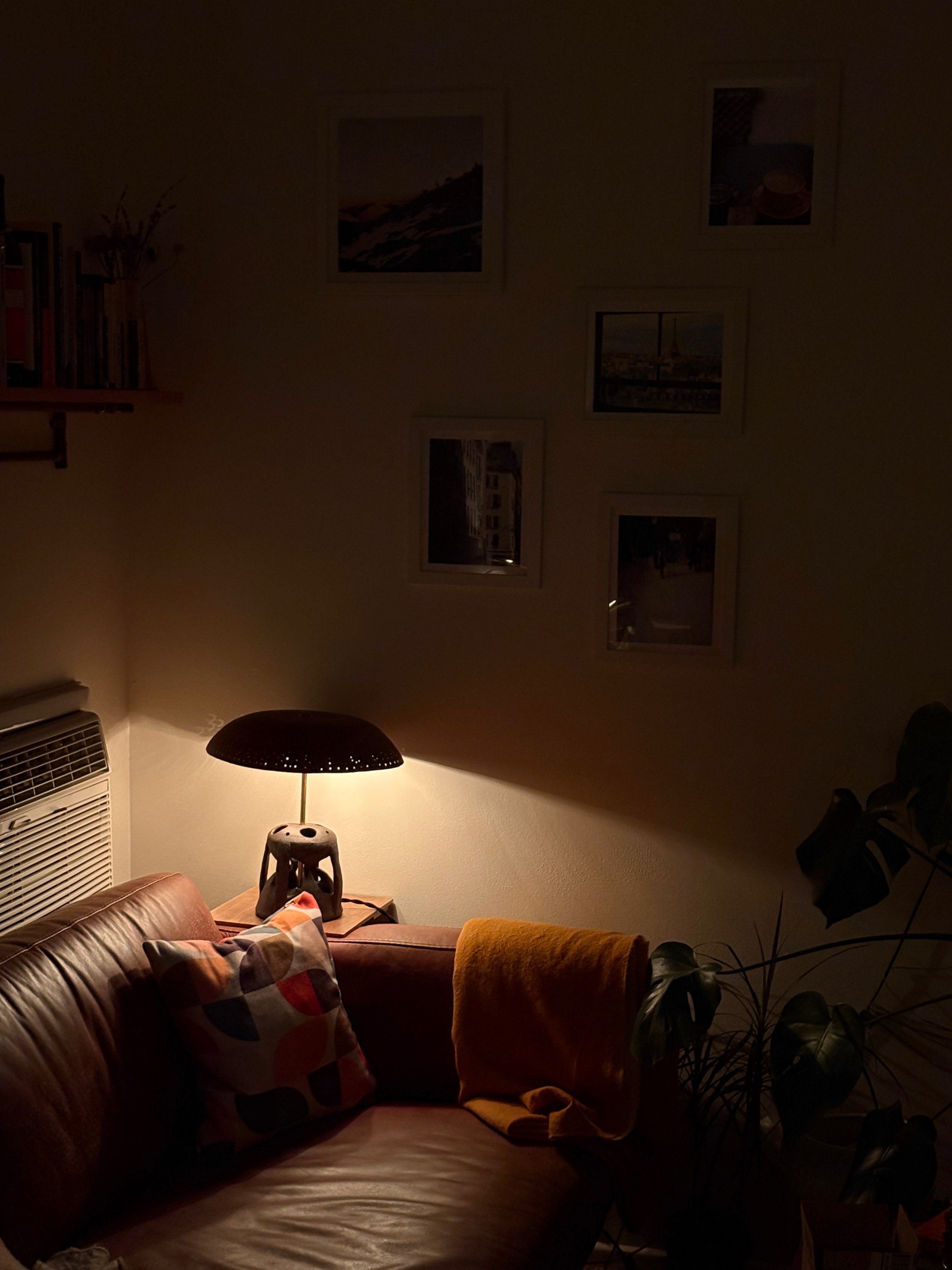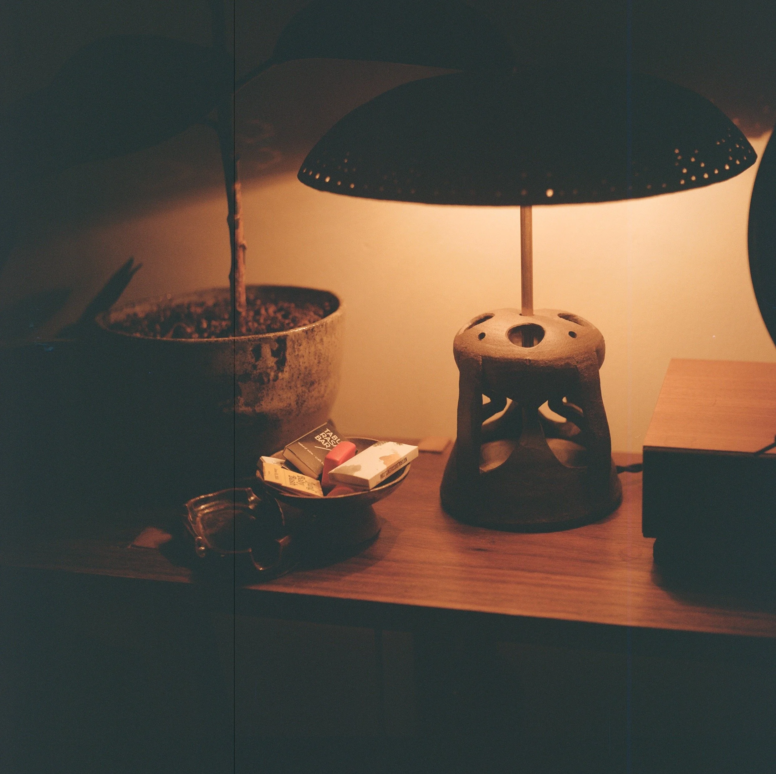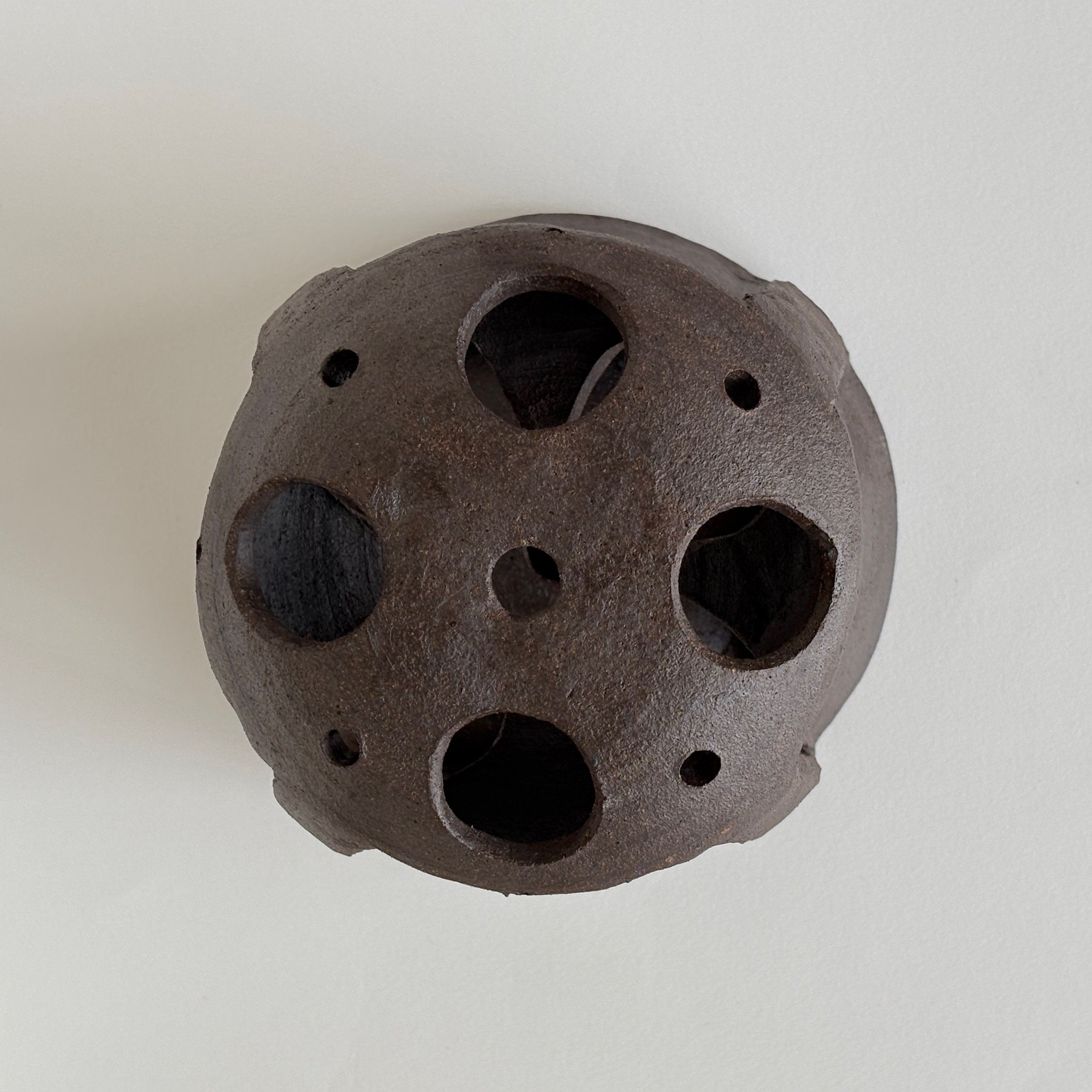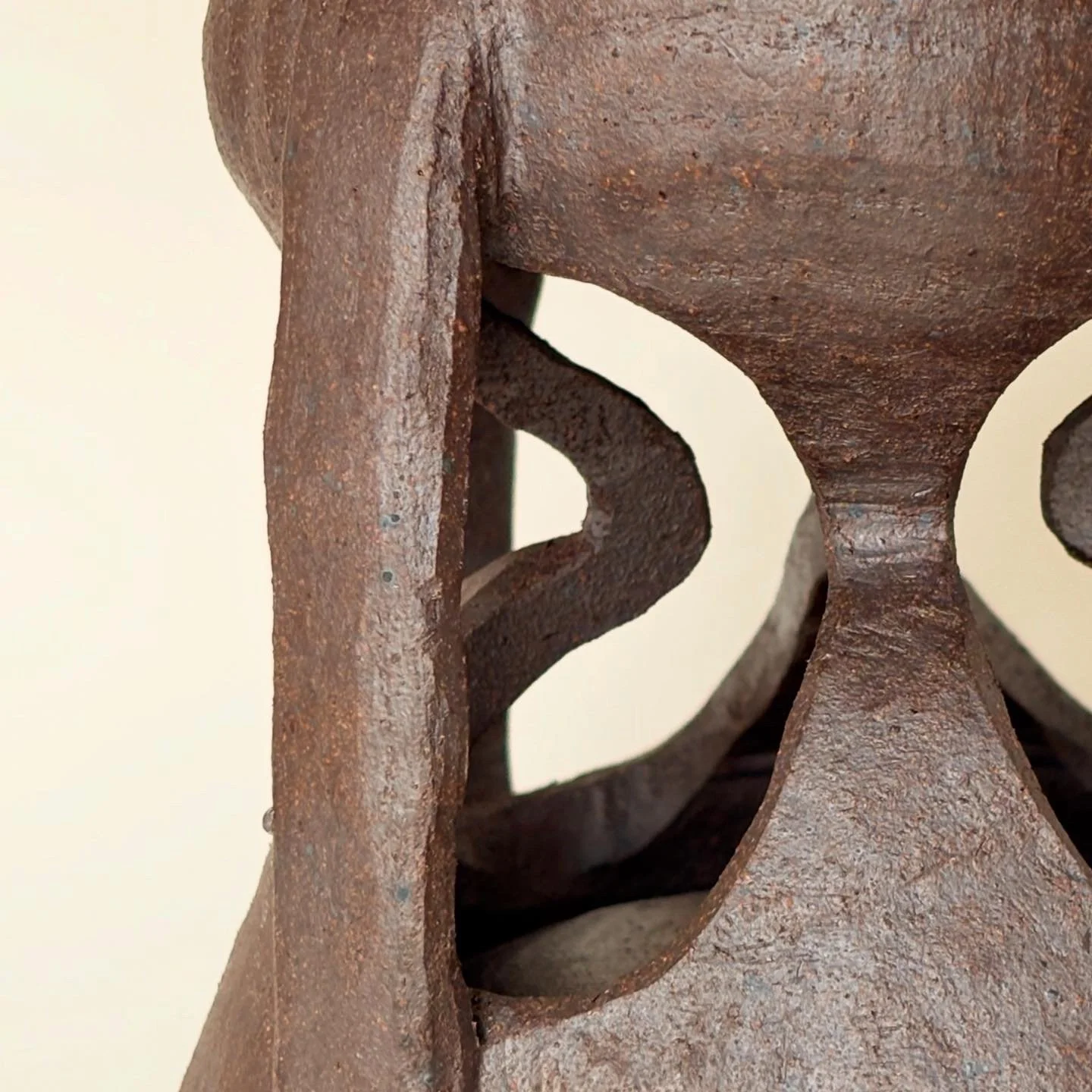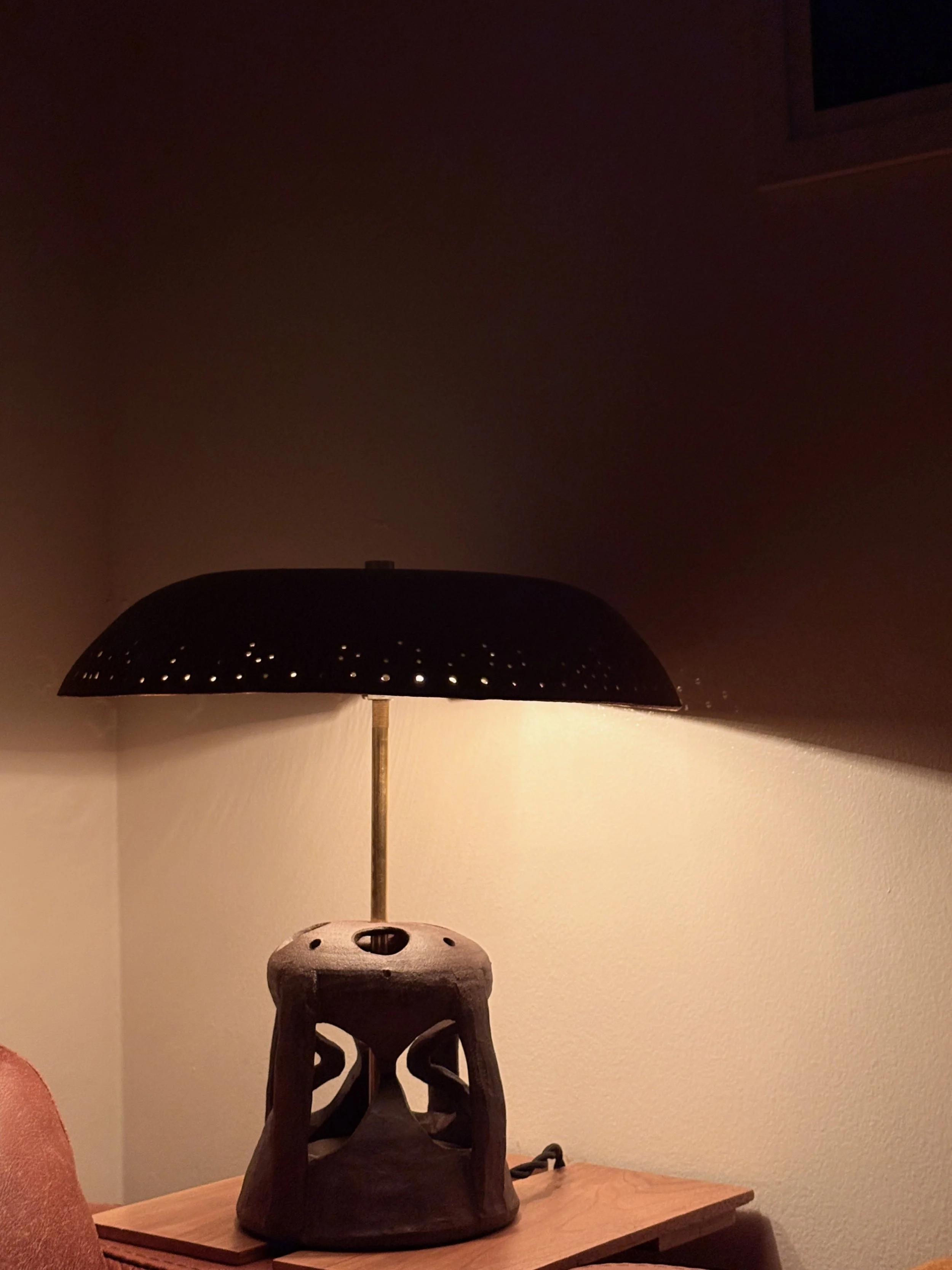 Hand-thrown, carved stoneware base with organic patterns. Stoneware shade with undulating perforations along the edge.