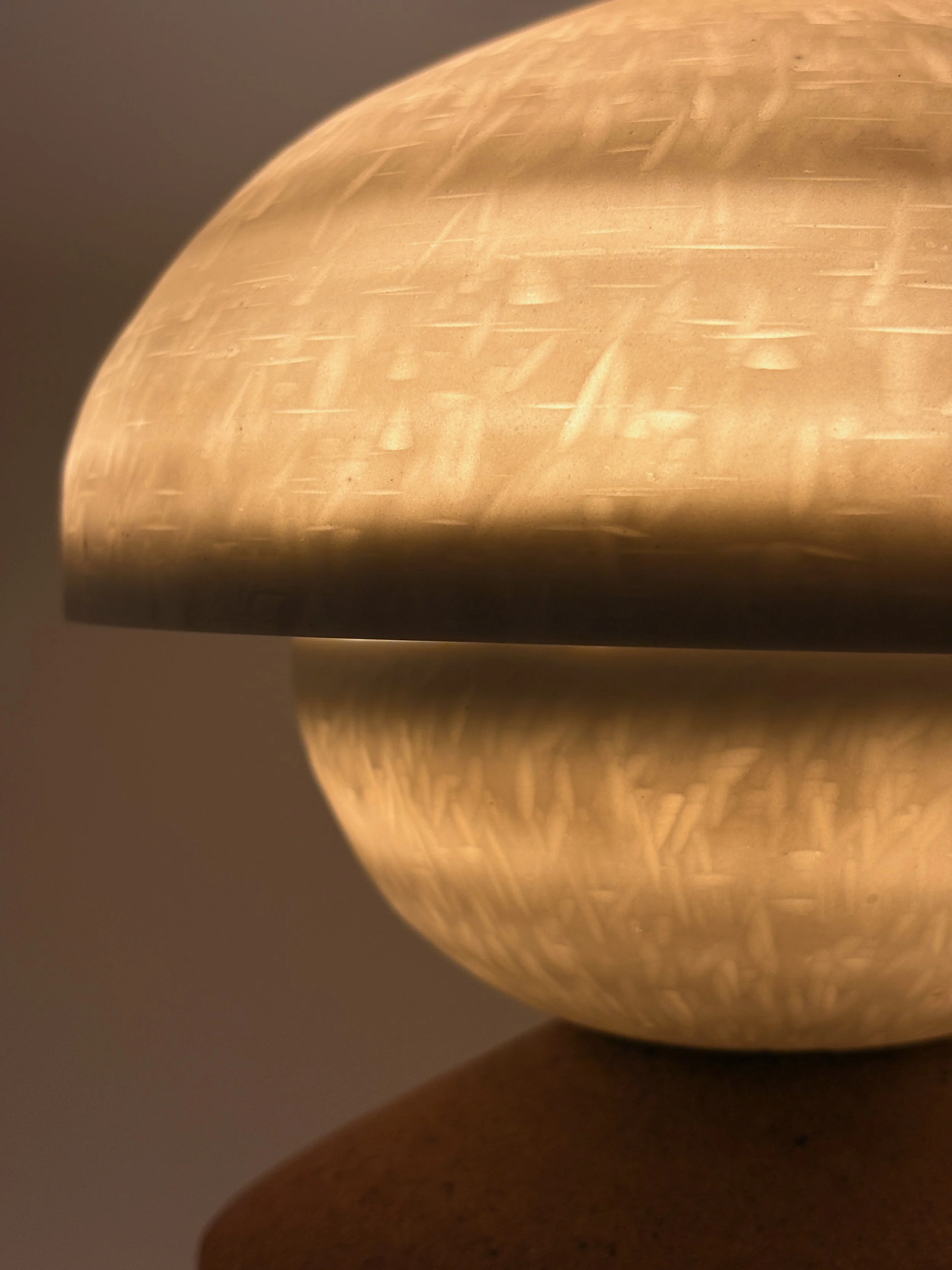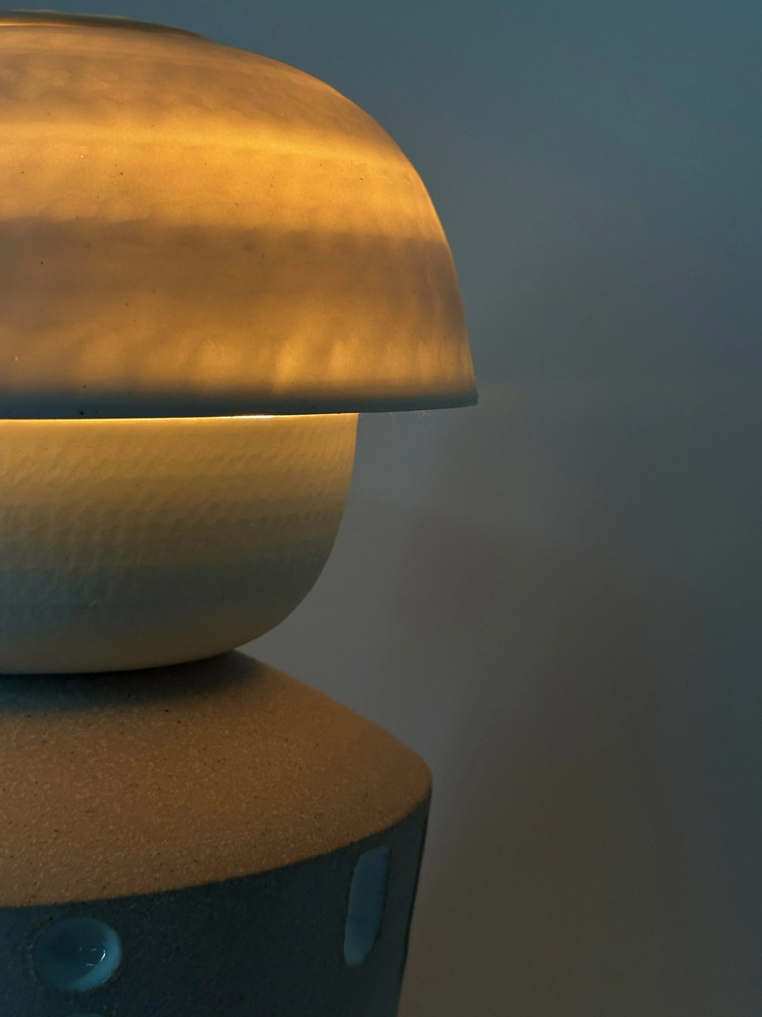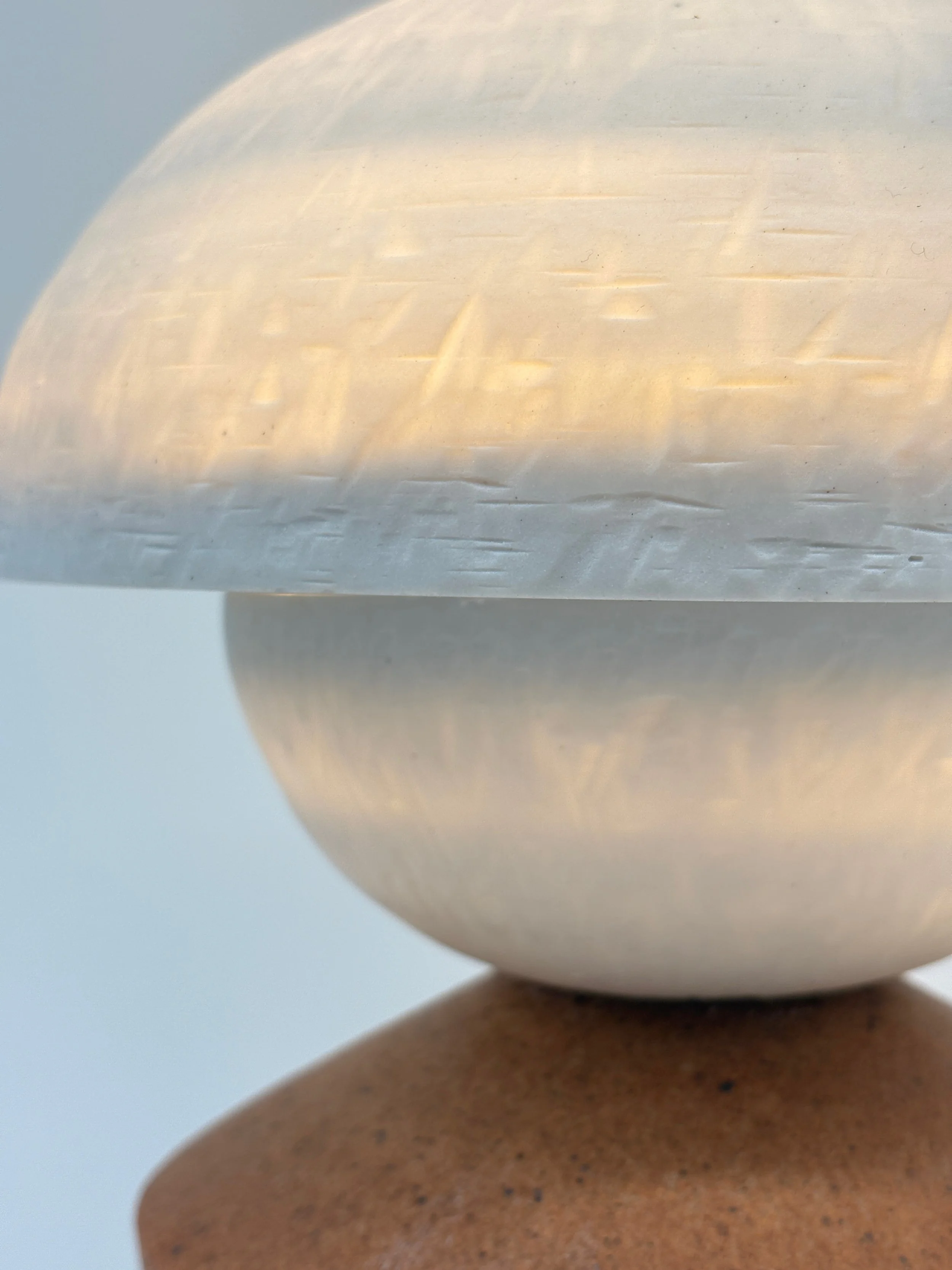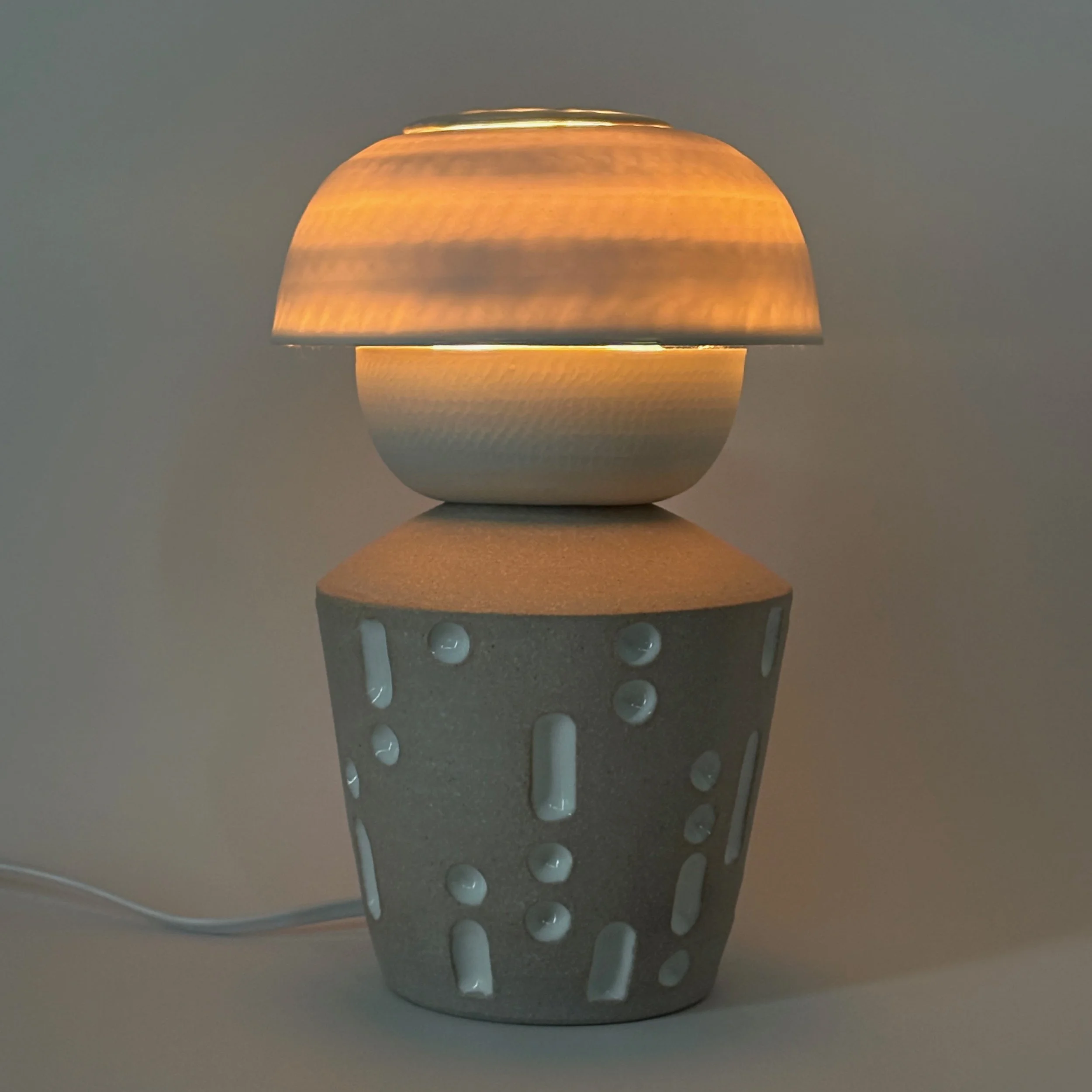 Stoneware base offering raw surface or carved patterns. Self-supporting, interlocking, and translucent porcelain shade emits soft and channeled light. An adjustable shield topping casts light and arced shadows on nearby surfaces.