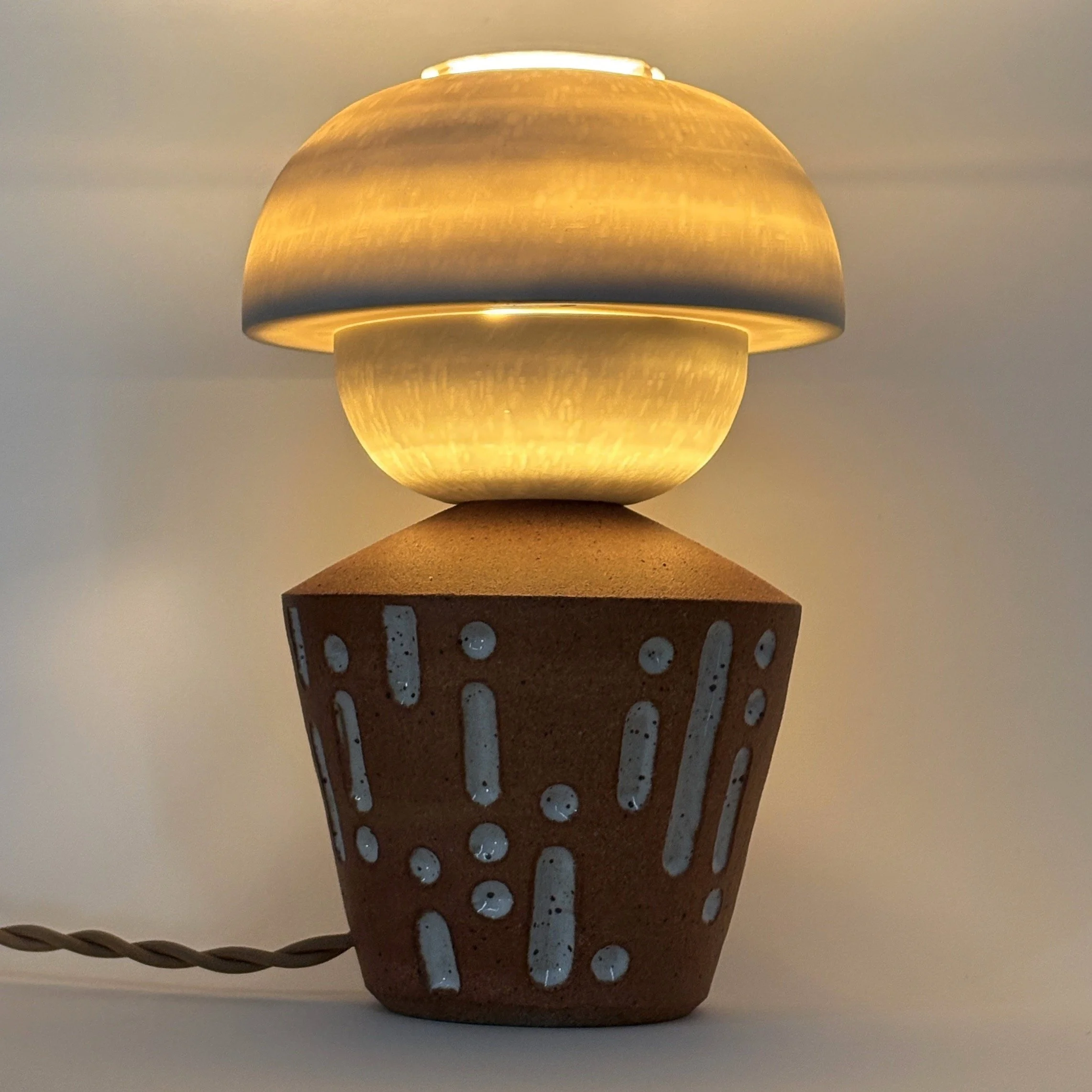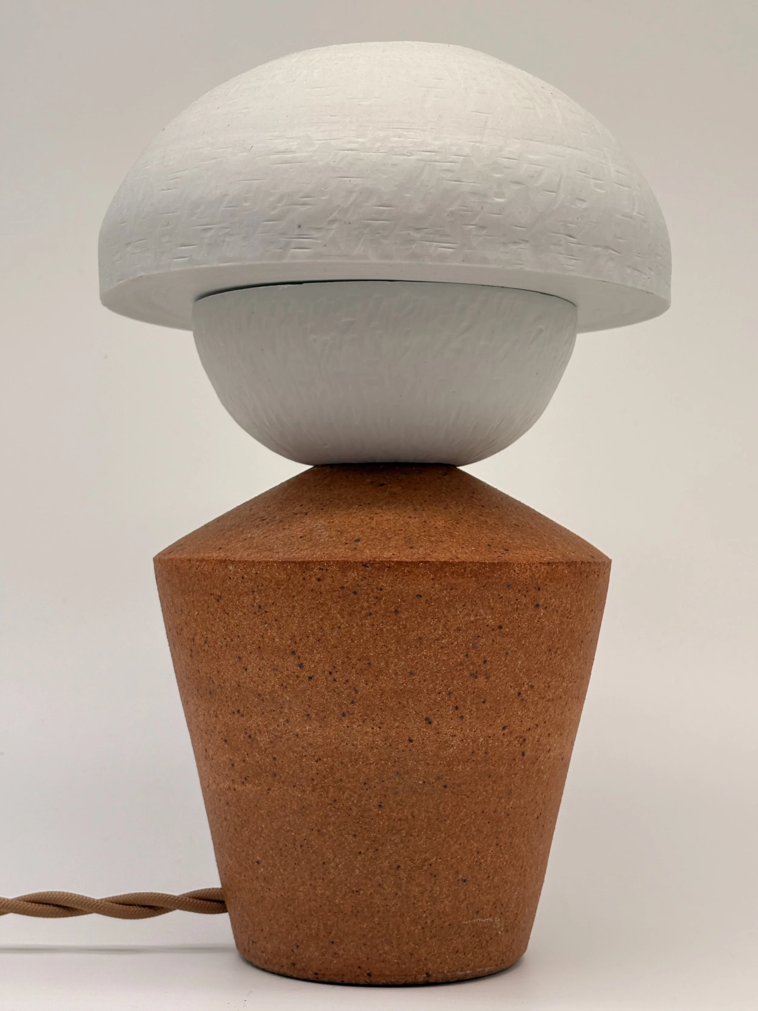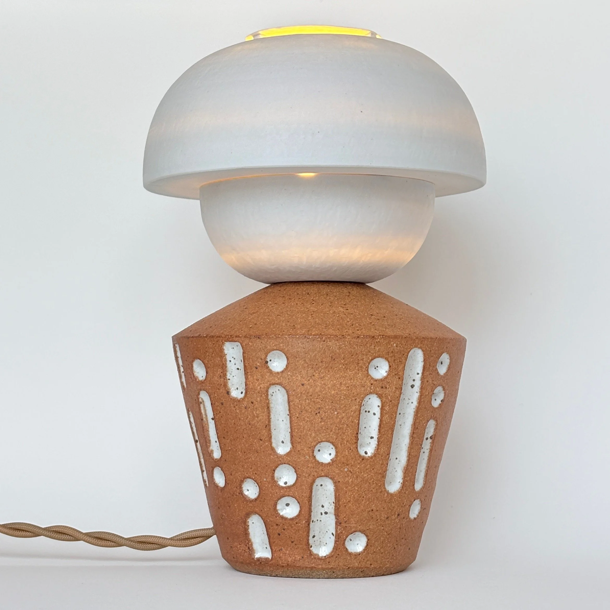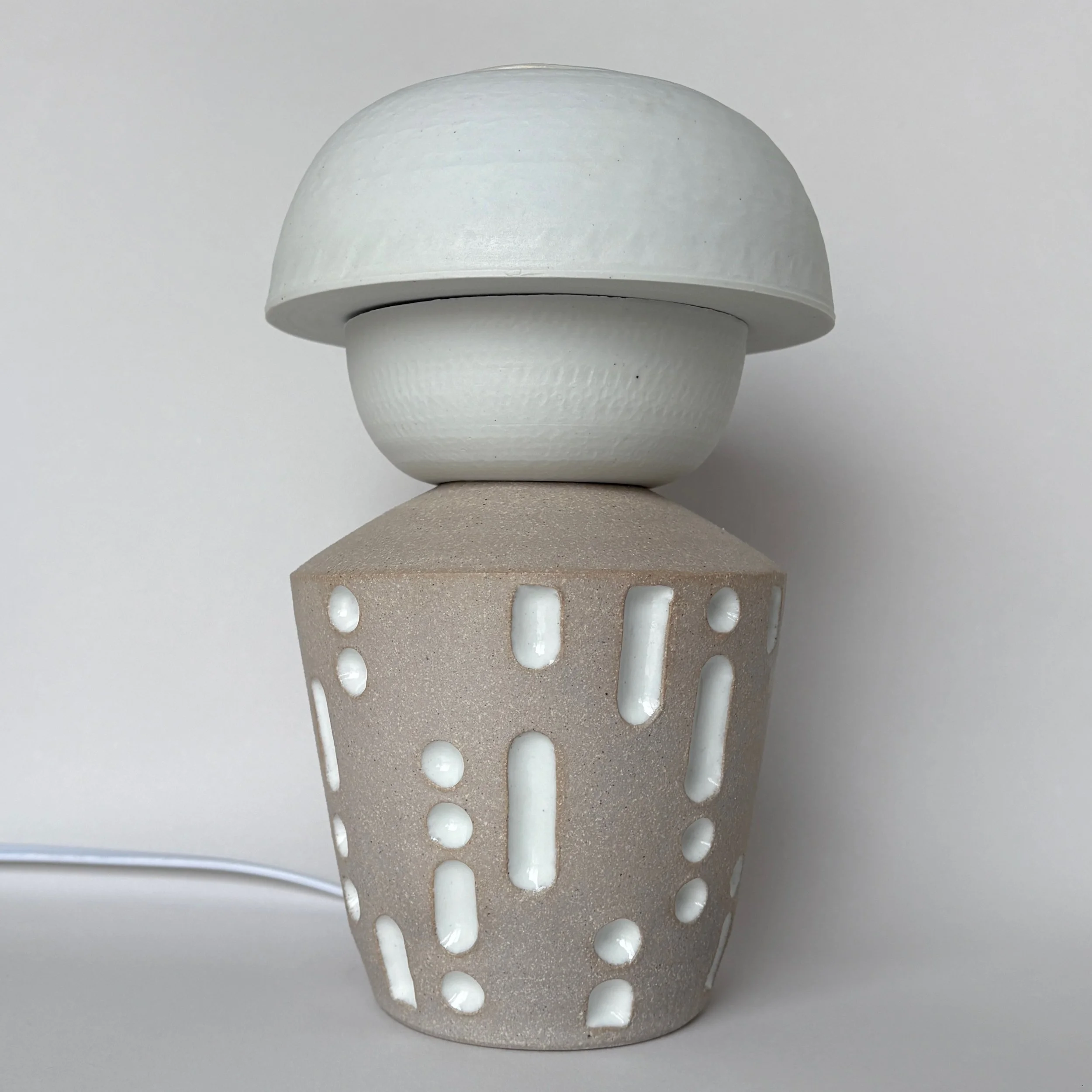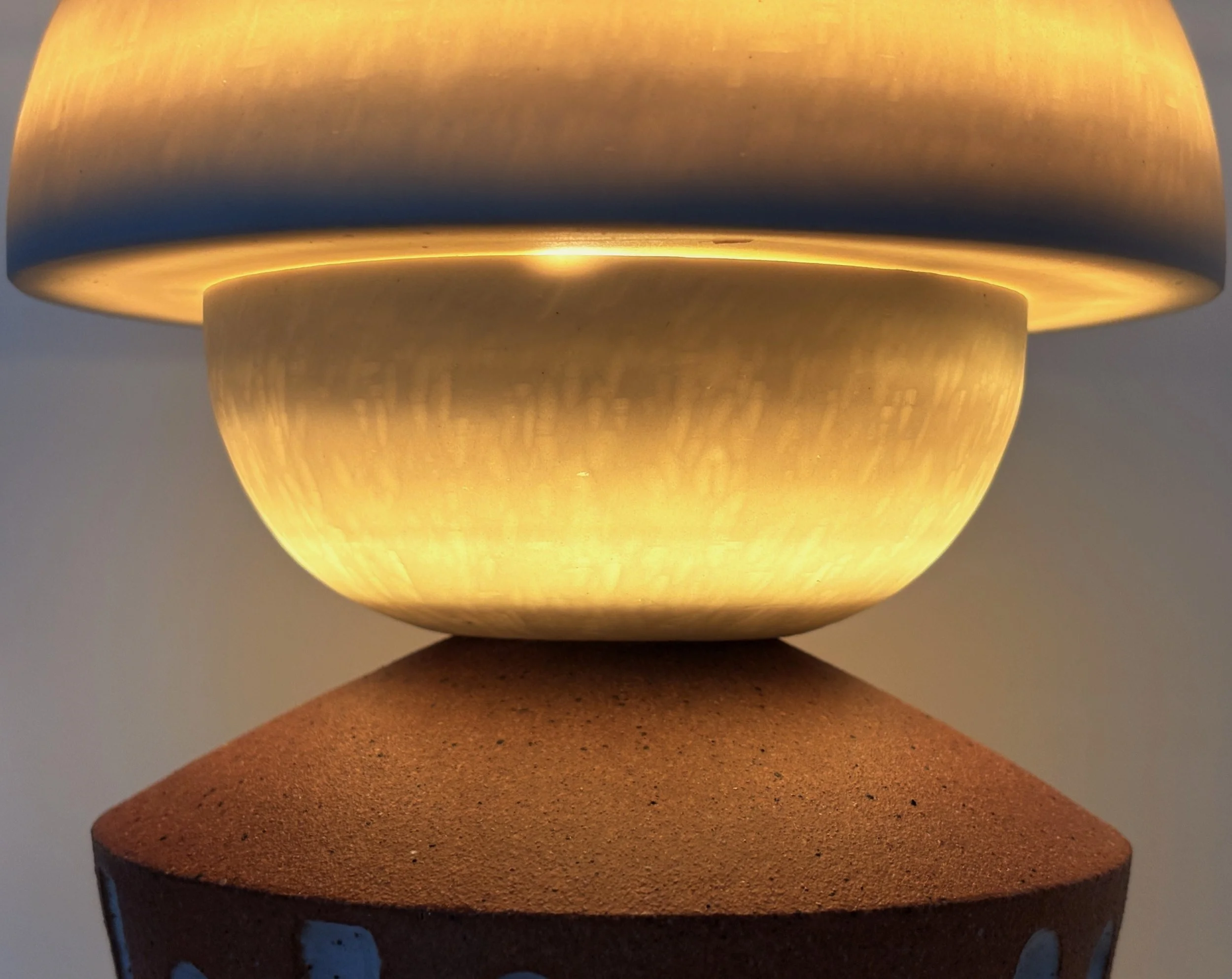 Stoneware base offering raw surface or carved patterns. Self-supporting, interlocking, and translucent porcelain shade emits soft and channeled light. An adjustable shield topping casts light and arced shadows on nearby surfaces.