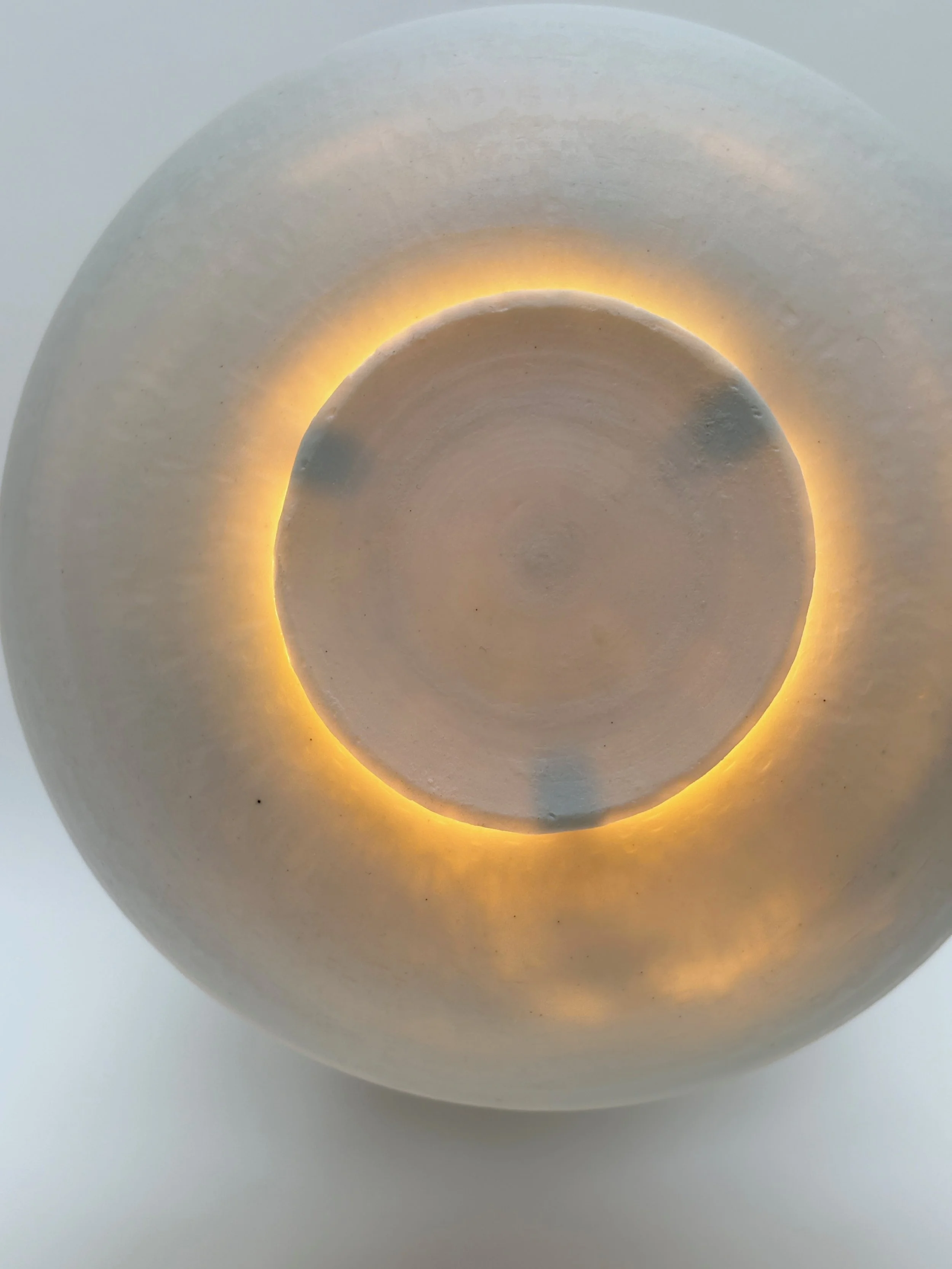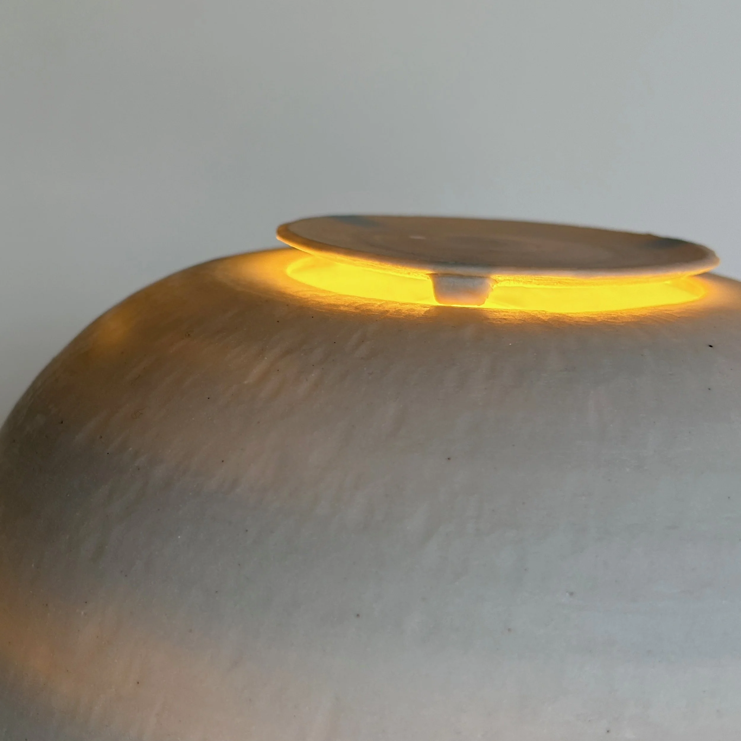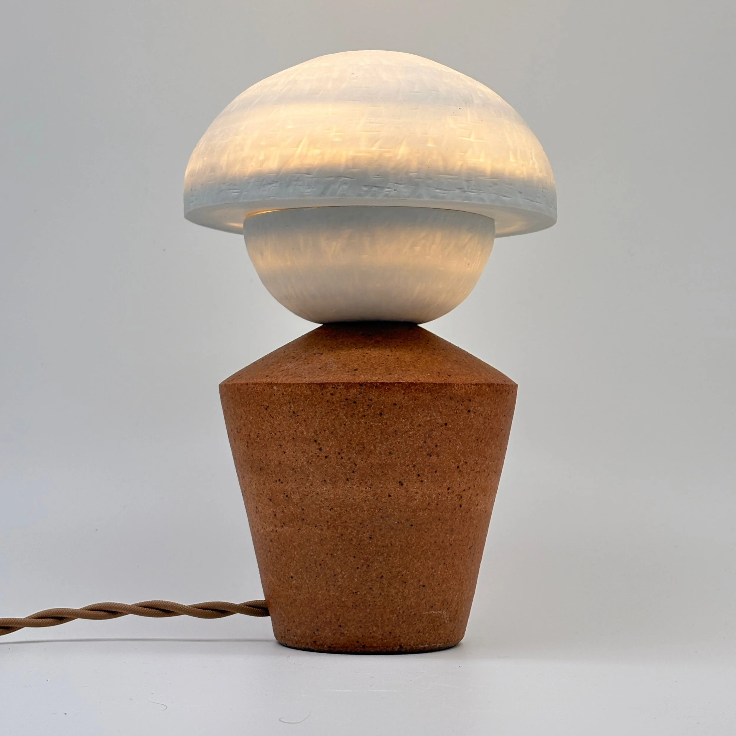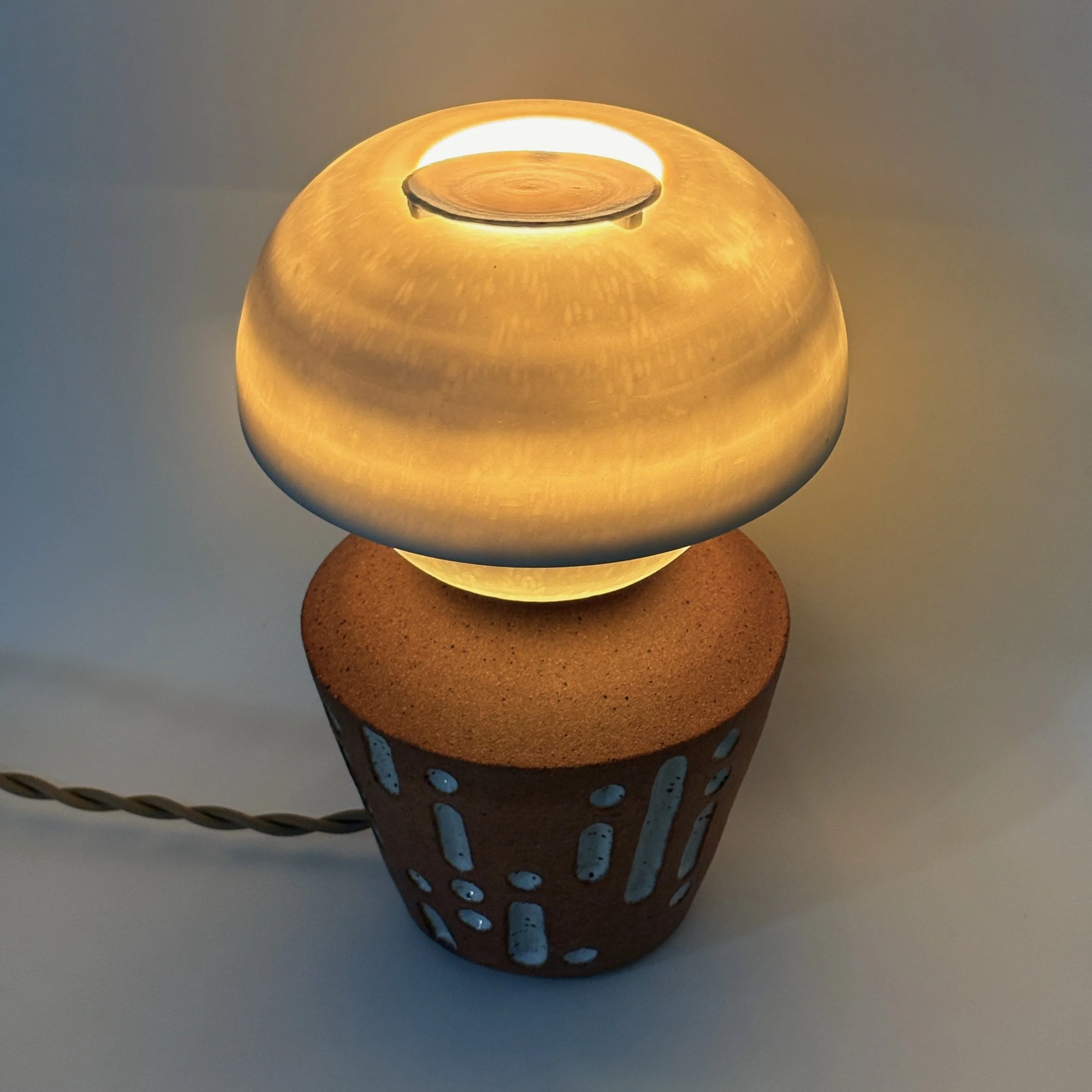Stoneware base offering raw surface or carved patterns. Self-supporting, interlocking, and translucent porcelain shade emits soft and channeled light. An adjustable shield topping casts light and arced shadows on nearby surfaces.