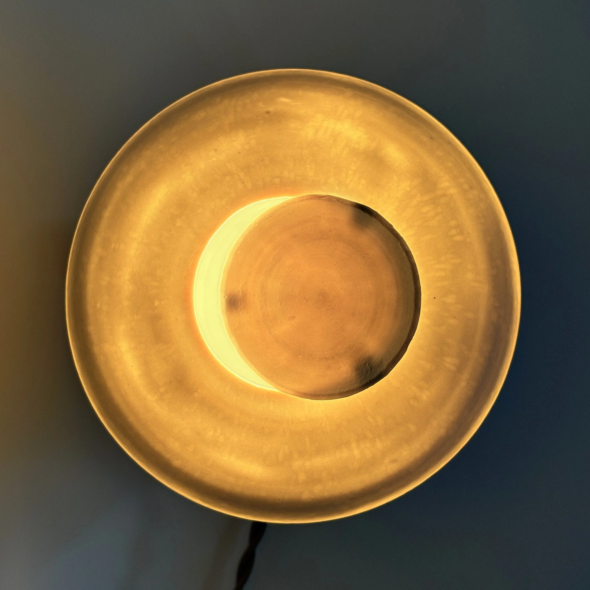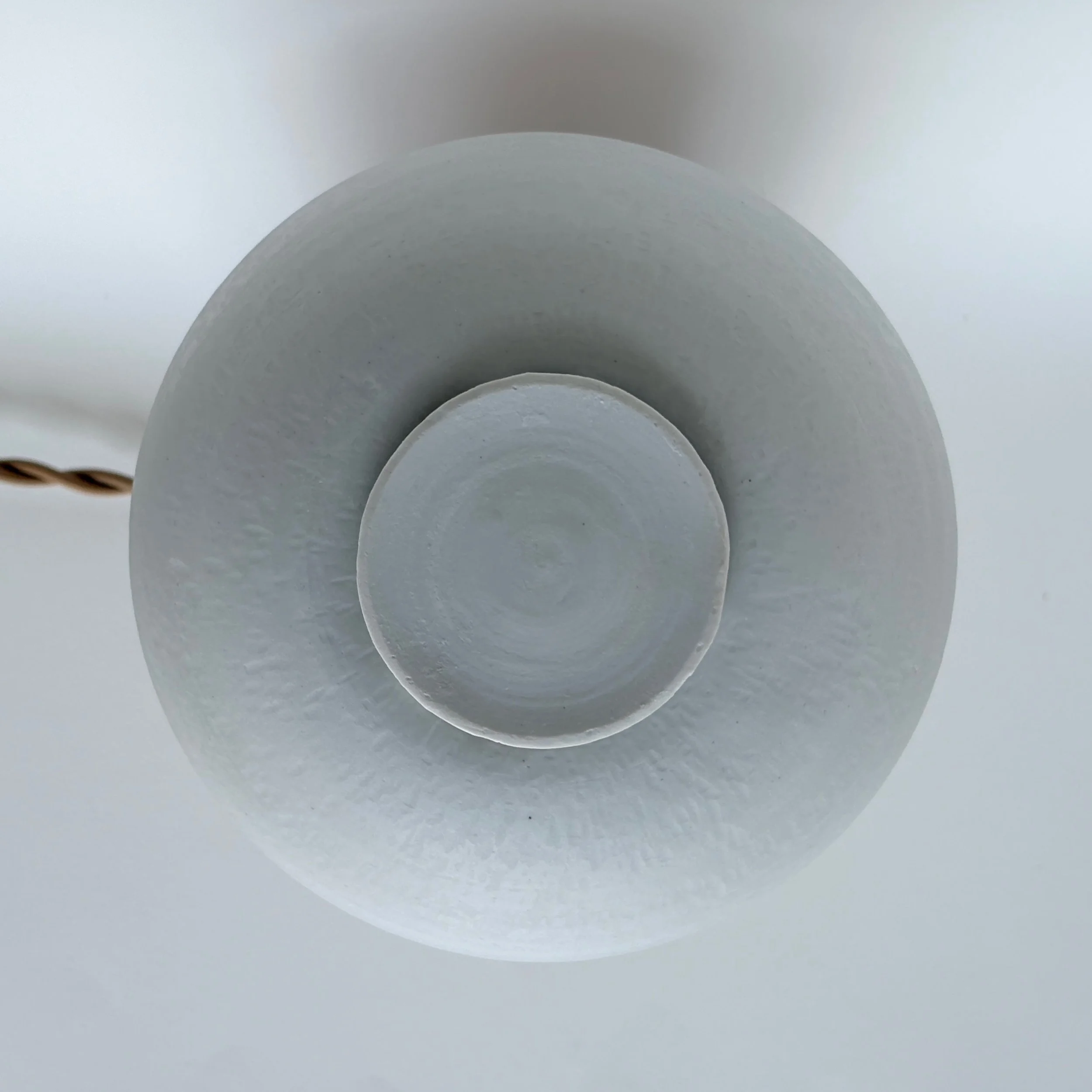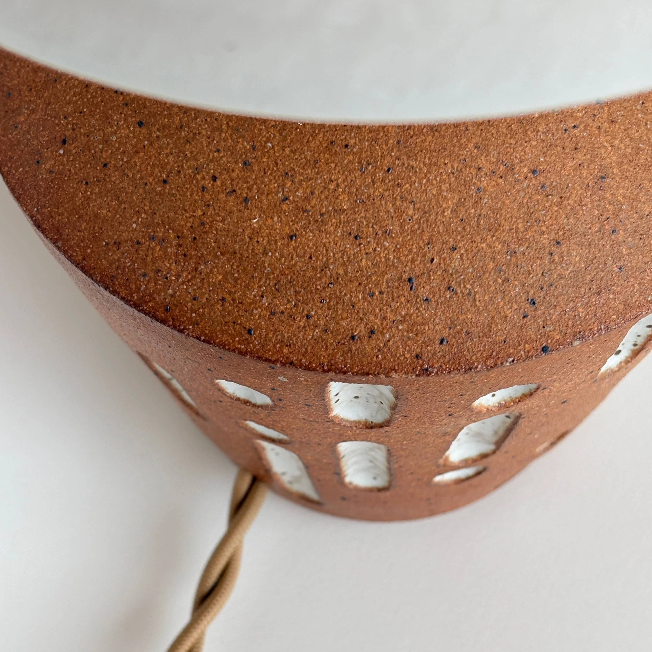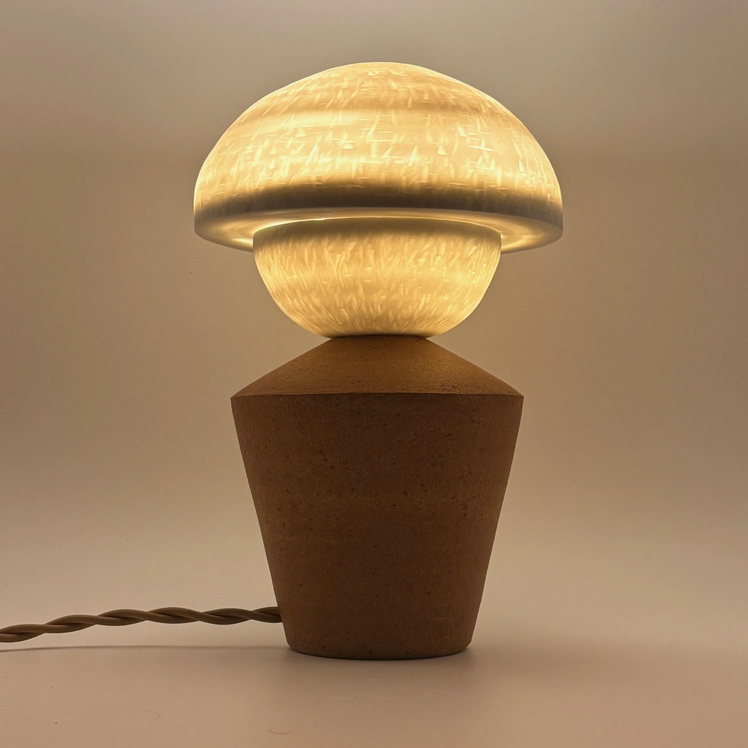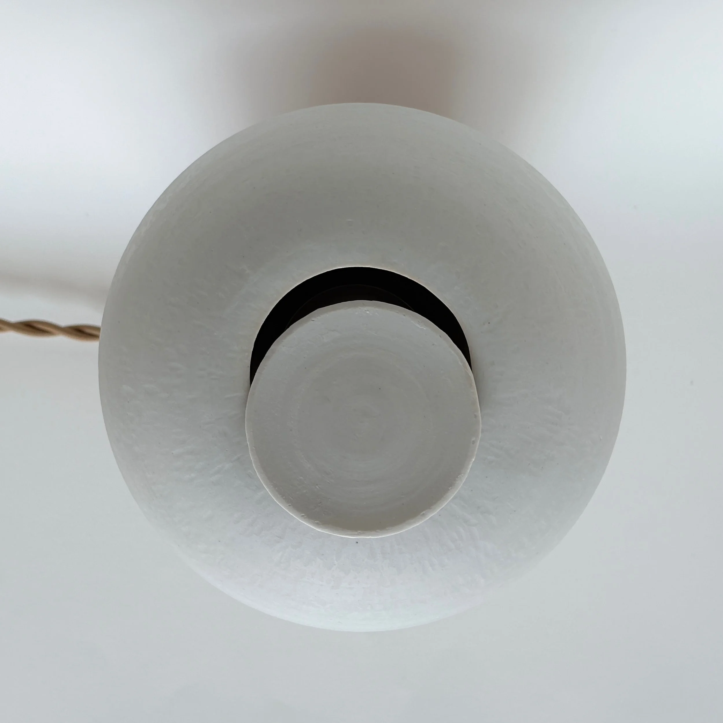 Stoneware base offering raw surface or carved patterns. Self-supporting, interlocking, and translucent porcelain shade emits soft and channeled light. An adjustable shield topping casts light and arced shadows on nearby surfaces.