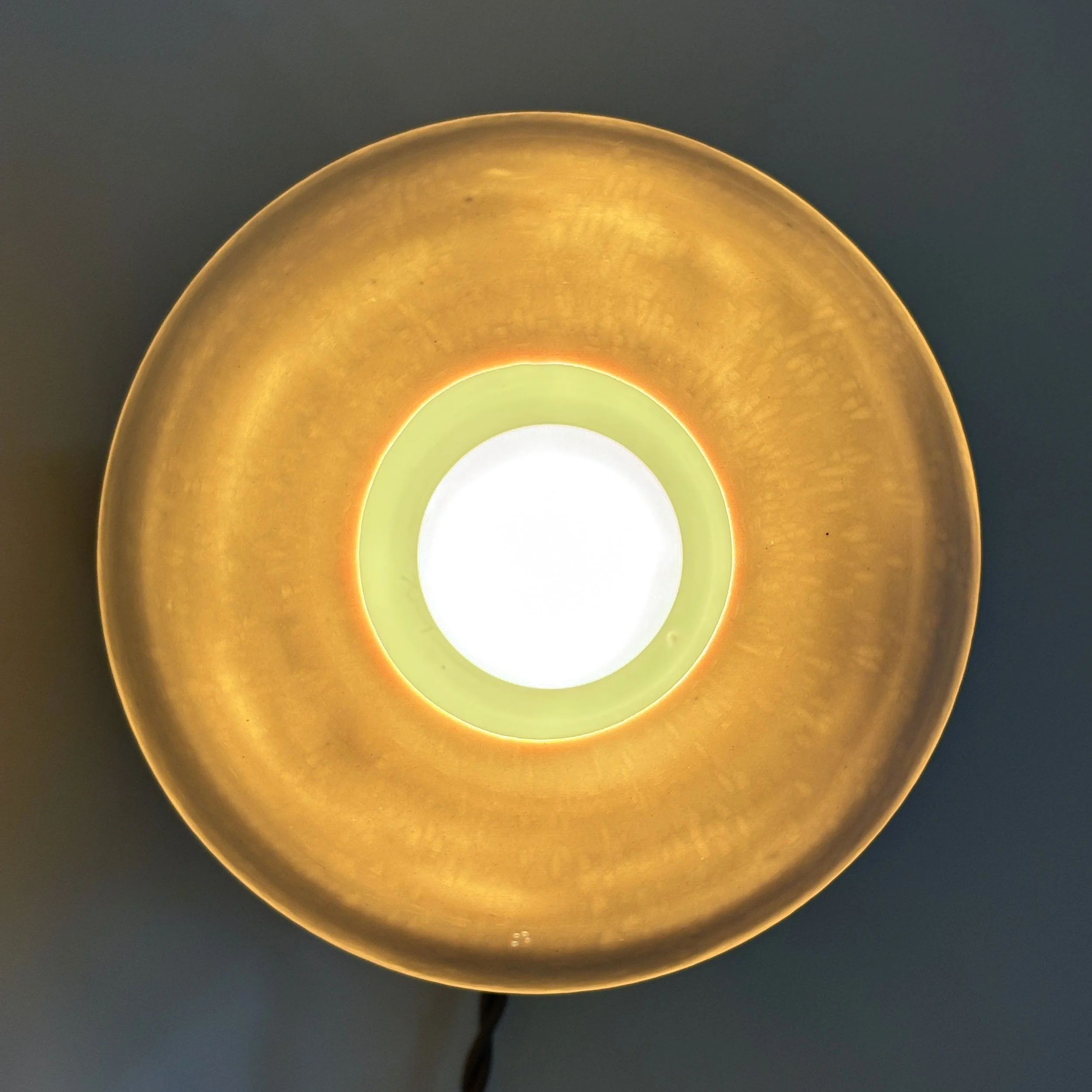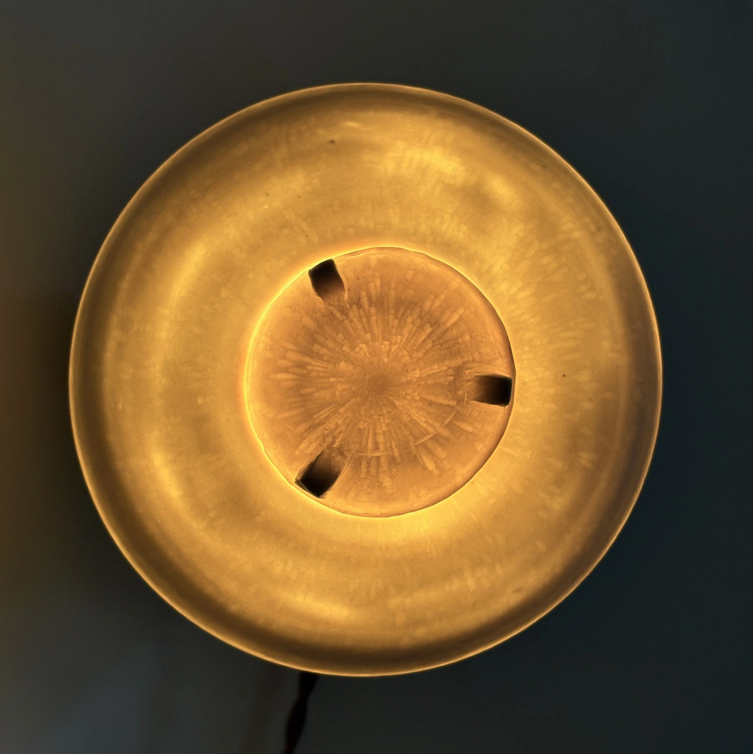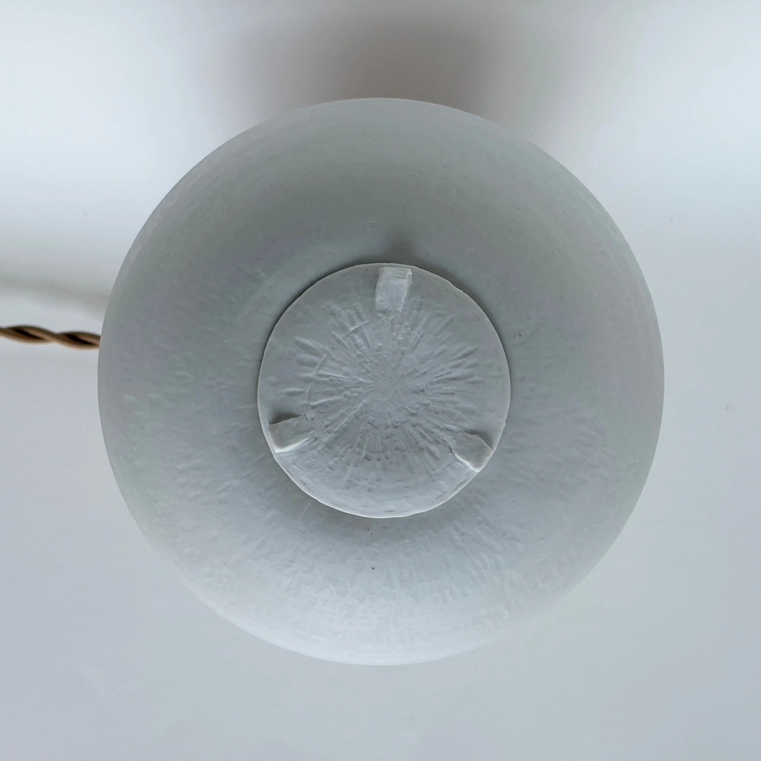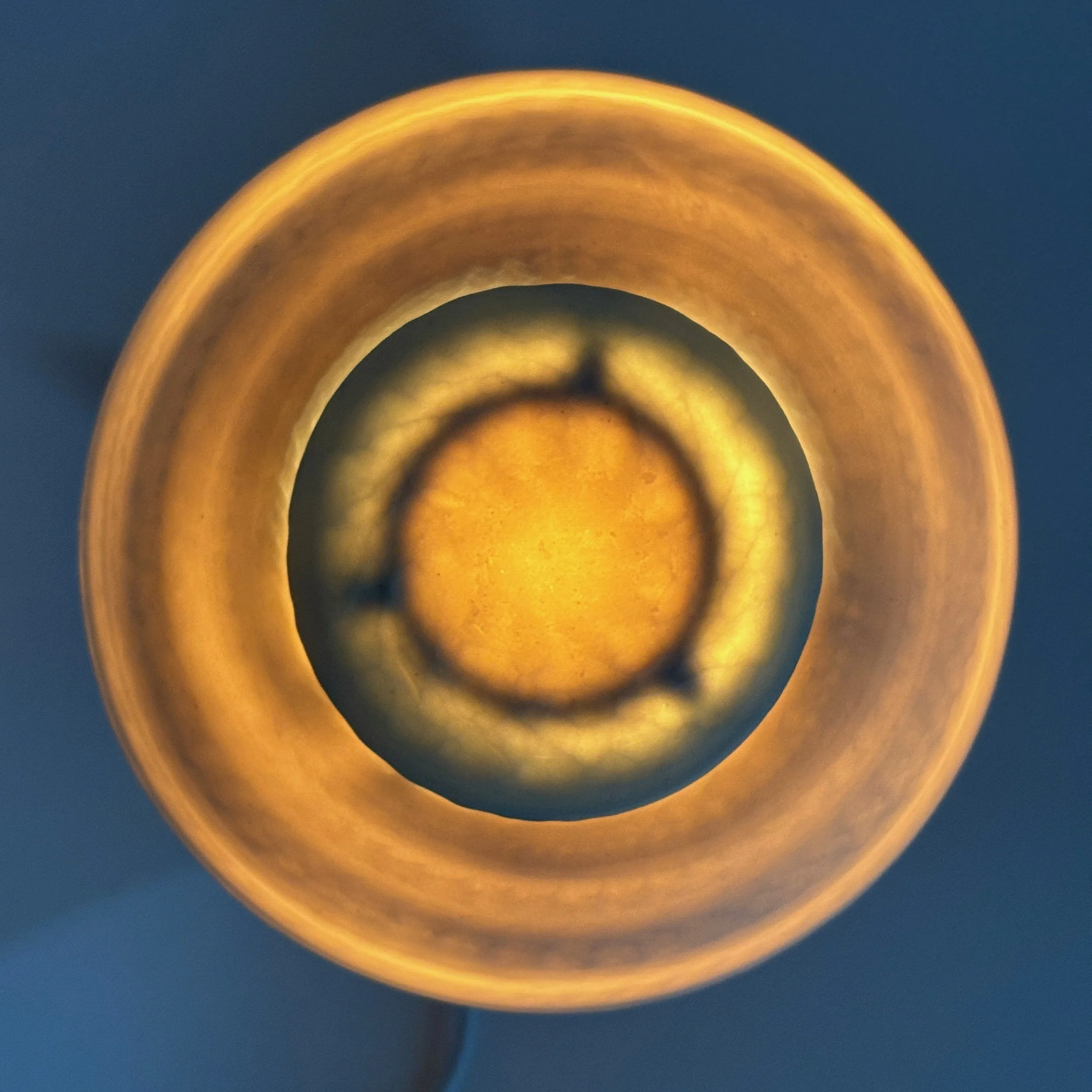 Stoneware base offering raw surface or carved patterns. Self-supporting, interlocking, and translucent porcelain shade emits soft and channeled light. An adjustable shield topping casts light and arced shadows on nearby surfaces.